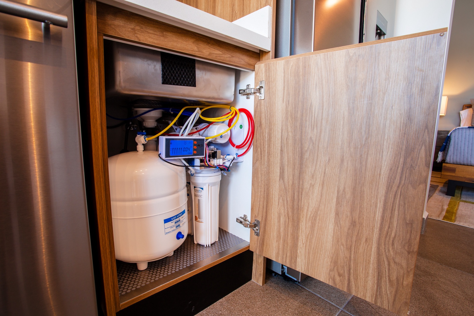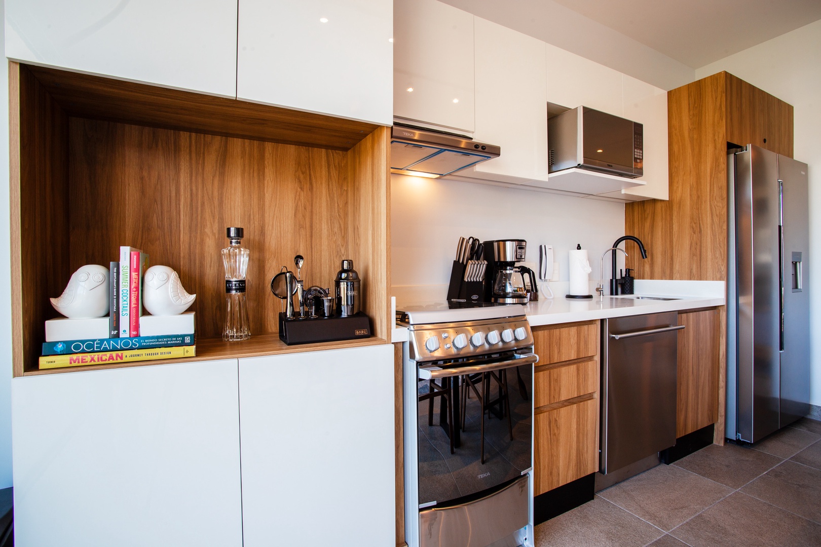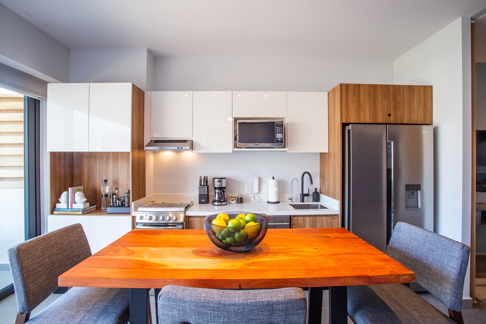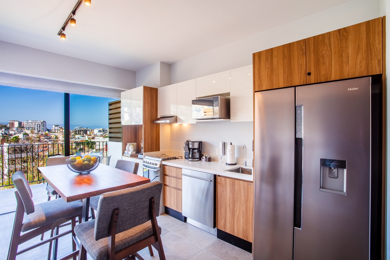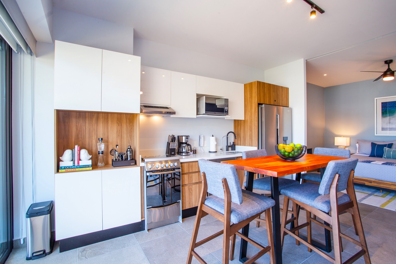 Prepare gourmet meals in the sleek and well-appointed kitchen, equipped with modern appliances, including a full-size fridge, stove, oven, dishwasher, and all the essentials for your culinary needs. Additionally, enjoy the convenience of bar amenities for crafting refreshing beverages and a dining table with seating for four to savor your culinary creations.