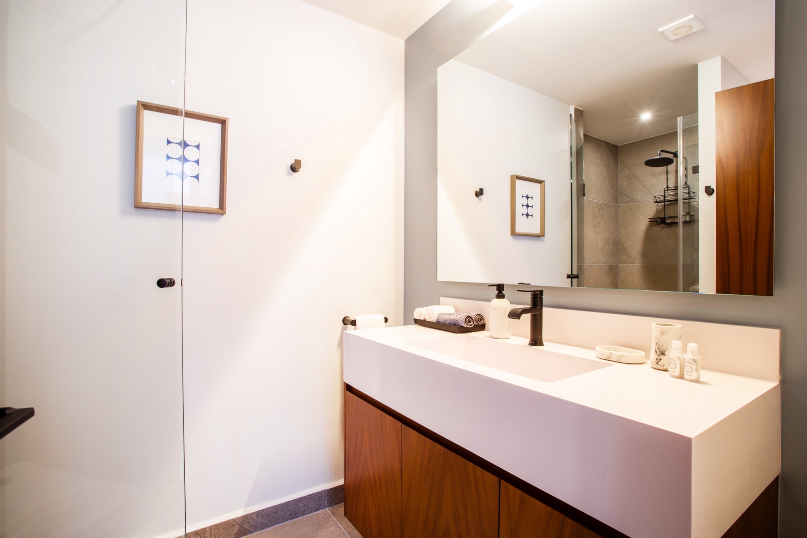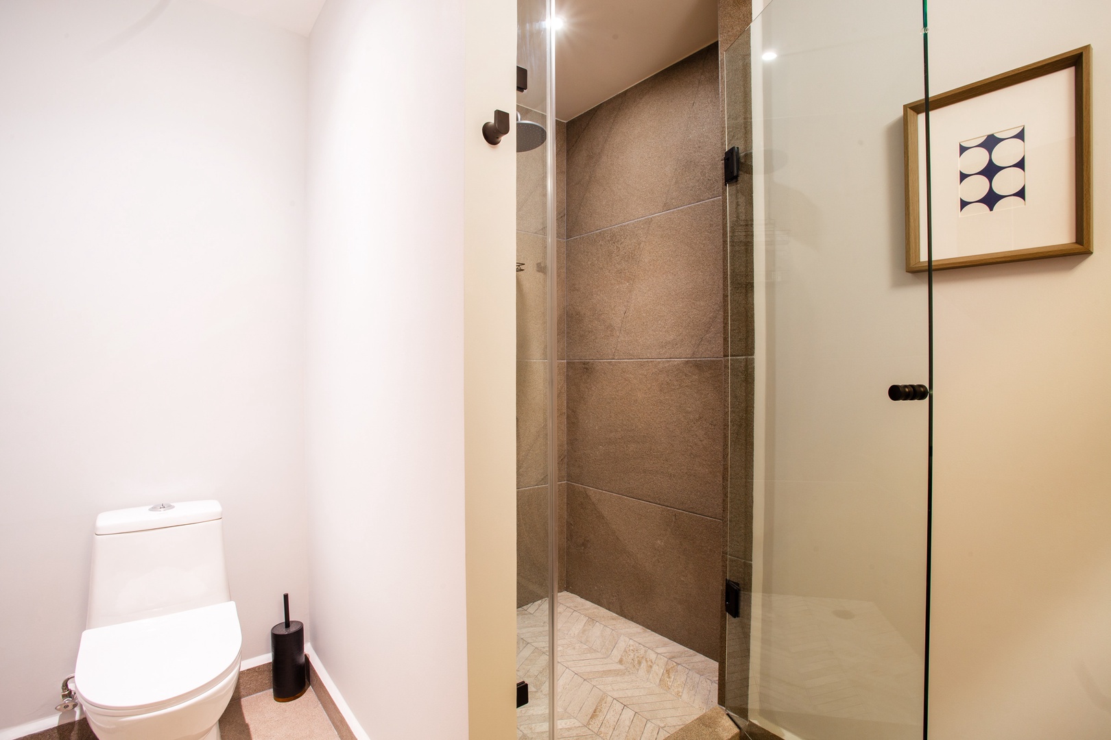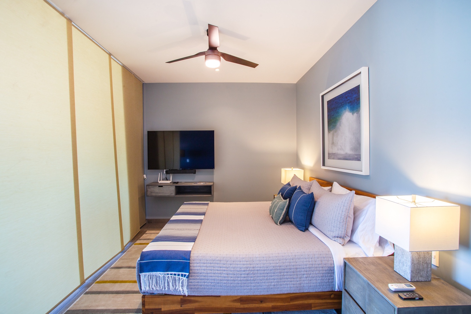 Unwind in the inviting bedroom featuring a sumptuous king-size bed and a smart TV, offering the perfect retreat after a day of adventure. Slide the screen shut for added privacy and seclusion.