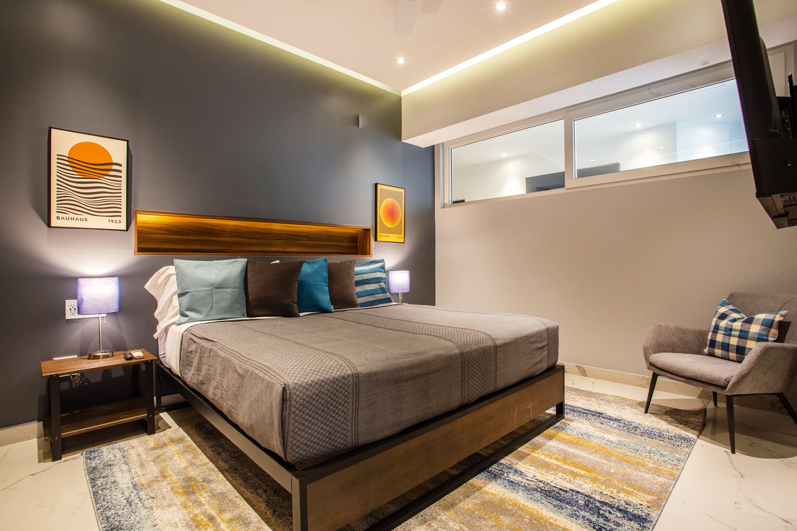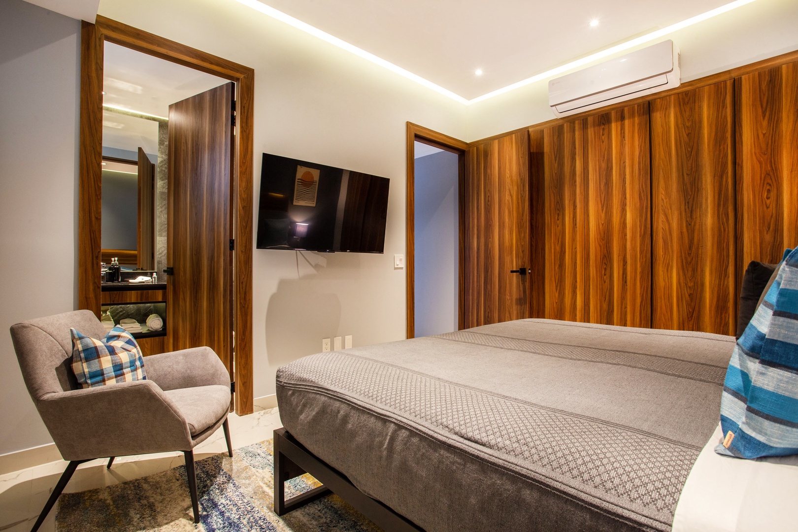 The bedroom features a comfortable king-sized bed, and the ensuite bathroom and smart TV add convenience.
