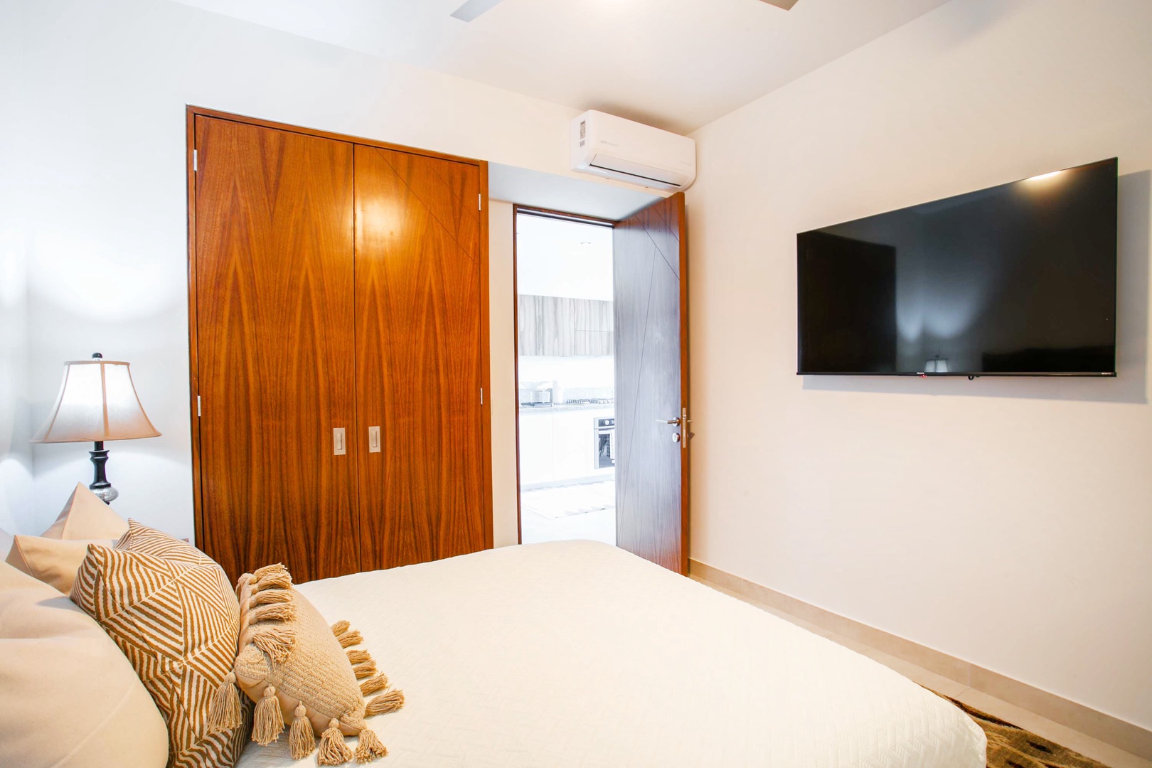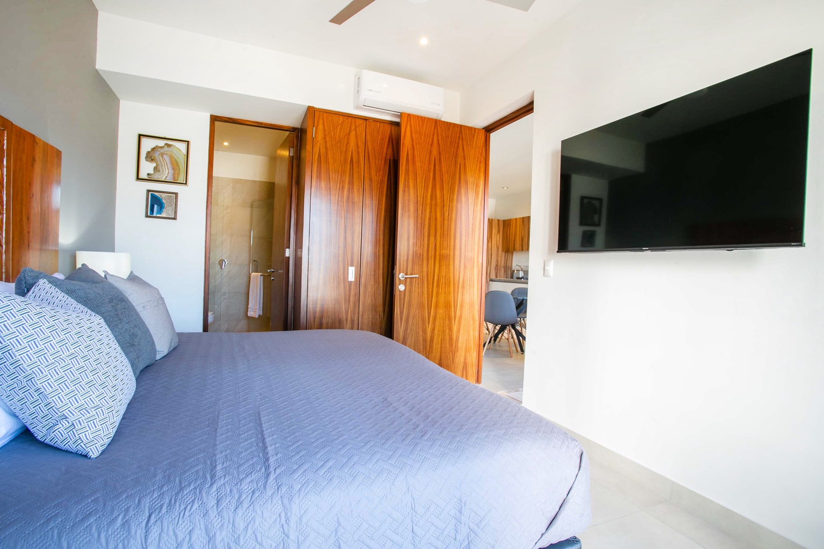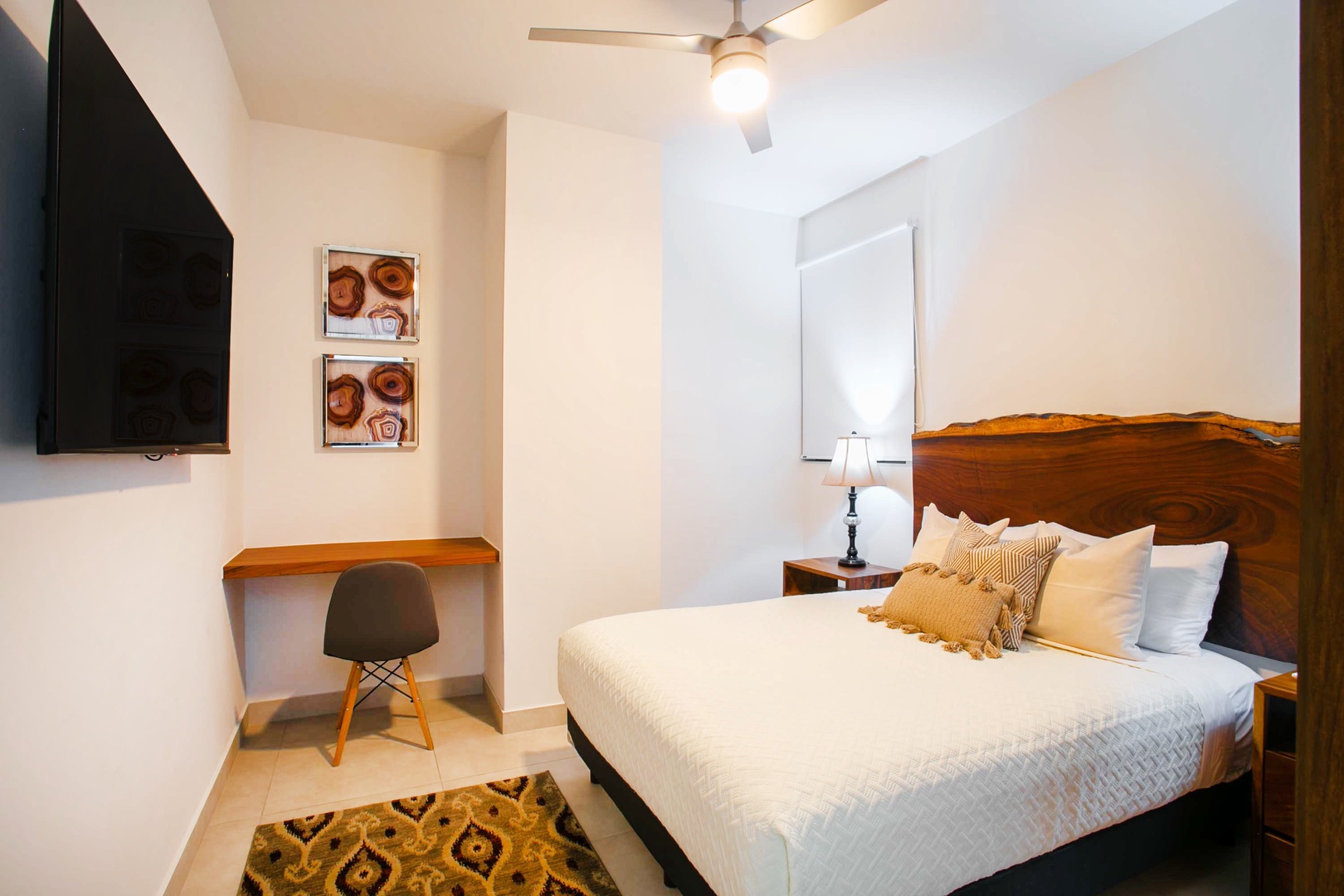 The guest bedroom is a retreat of its own, featuring a queen-size bed, smart TV, and a dedicated workspace for those mixing business with pleasure.
