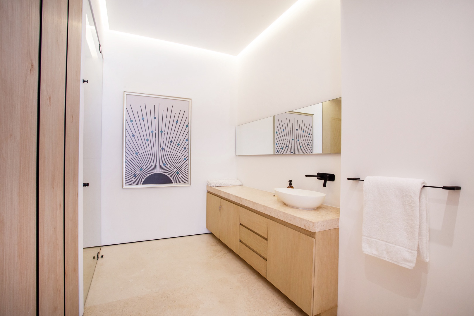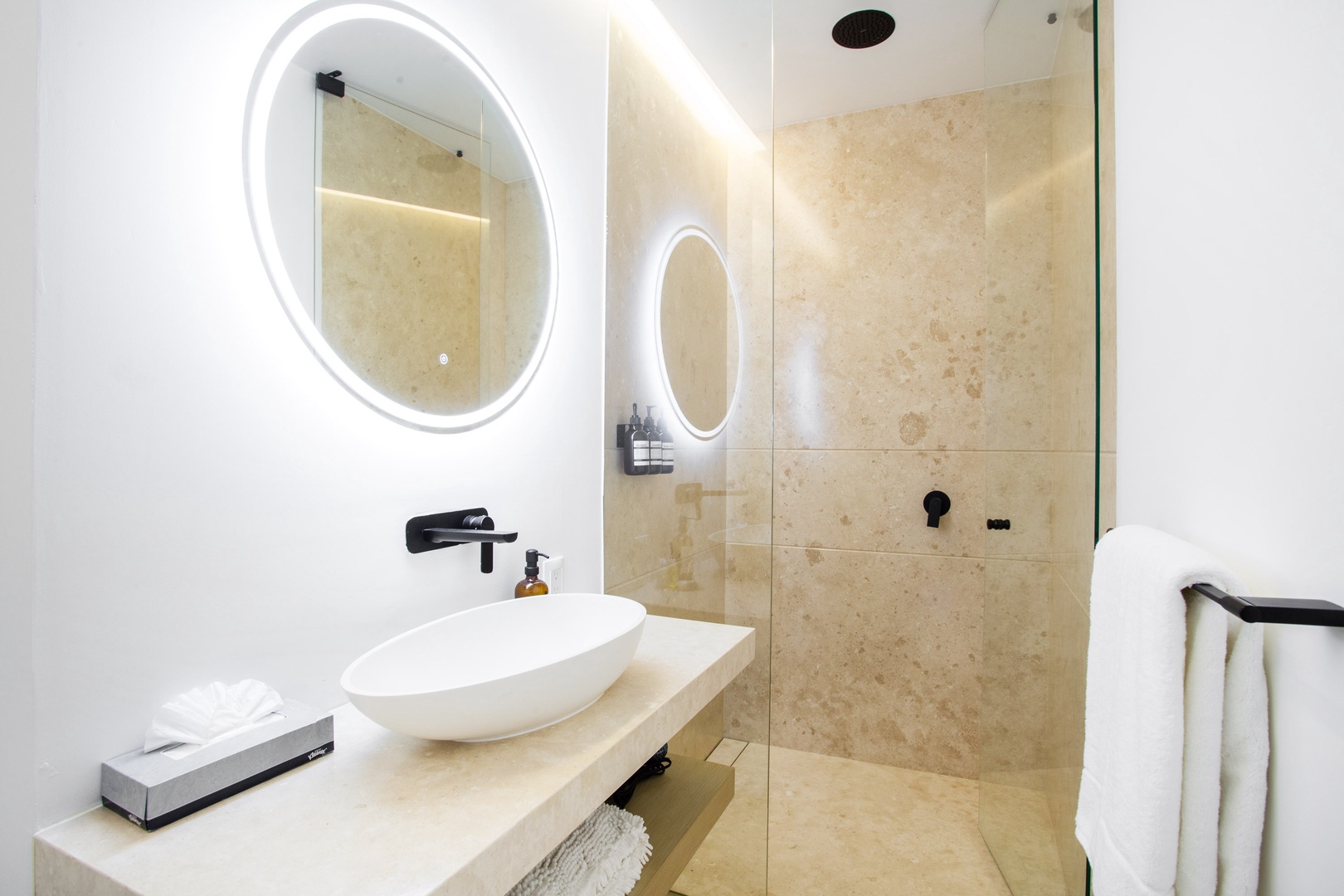 Both full bathrooms are adorned with rain showerheads and premium finishes, evoking a serene, spa-like ambiance perfect for unwinding after a day of adventure.