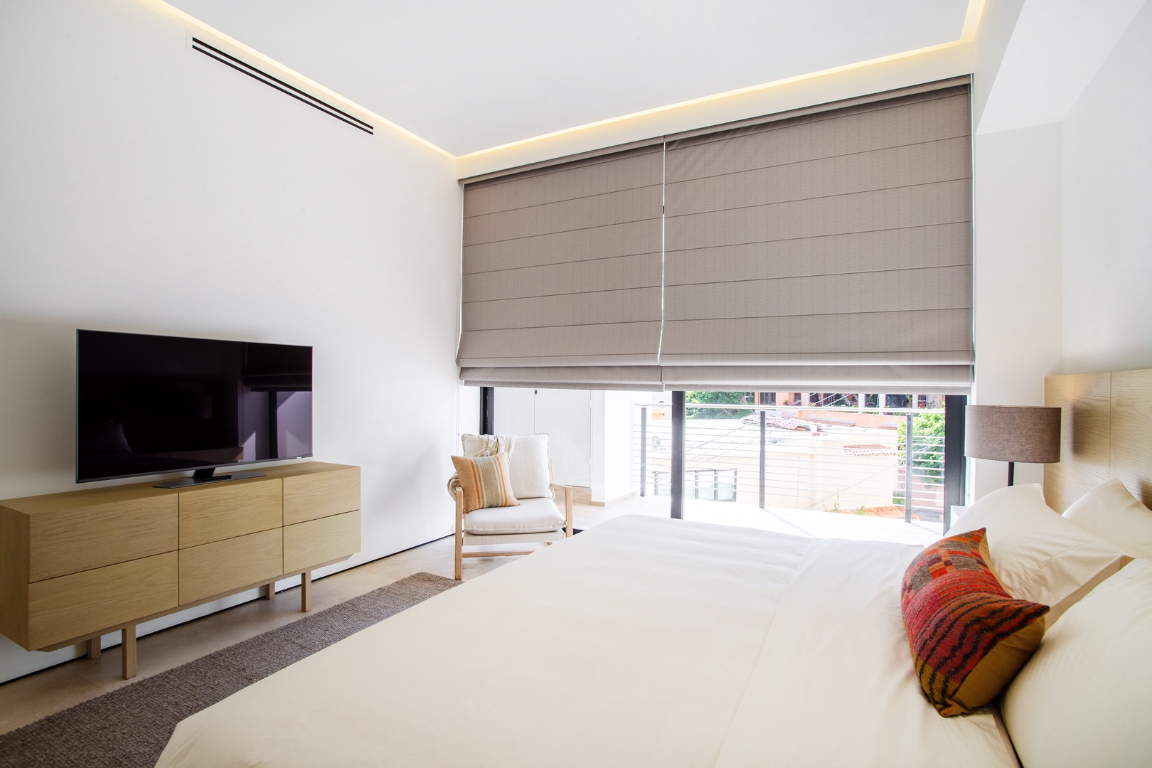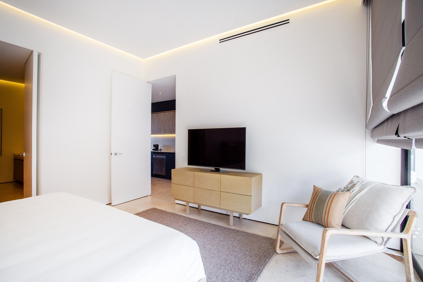 Retreat to the spacious bedroom featuring a plush king-size bed, smart TV, and a private ensuite bathroom designed for ultimate comfort and relaxation.