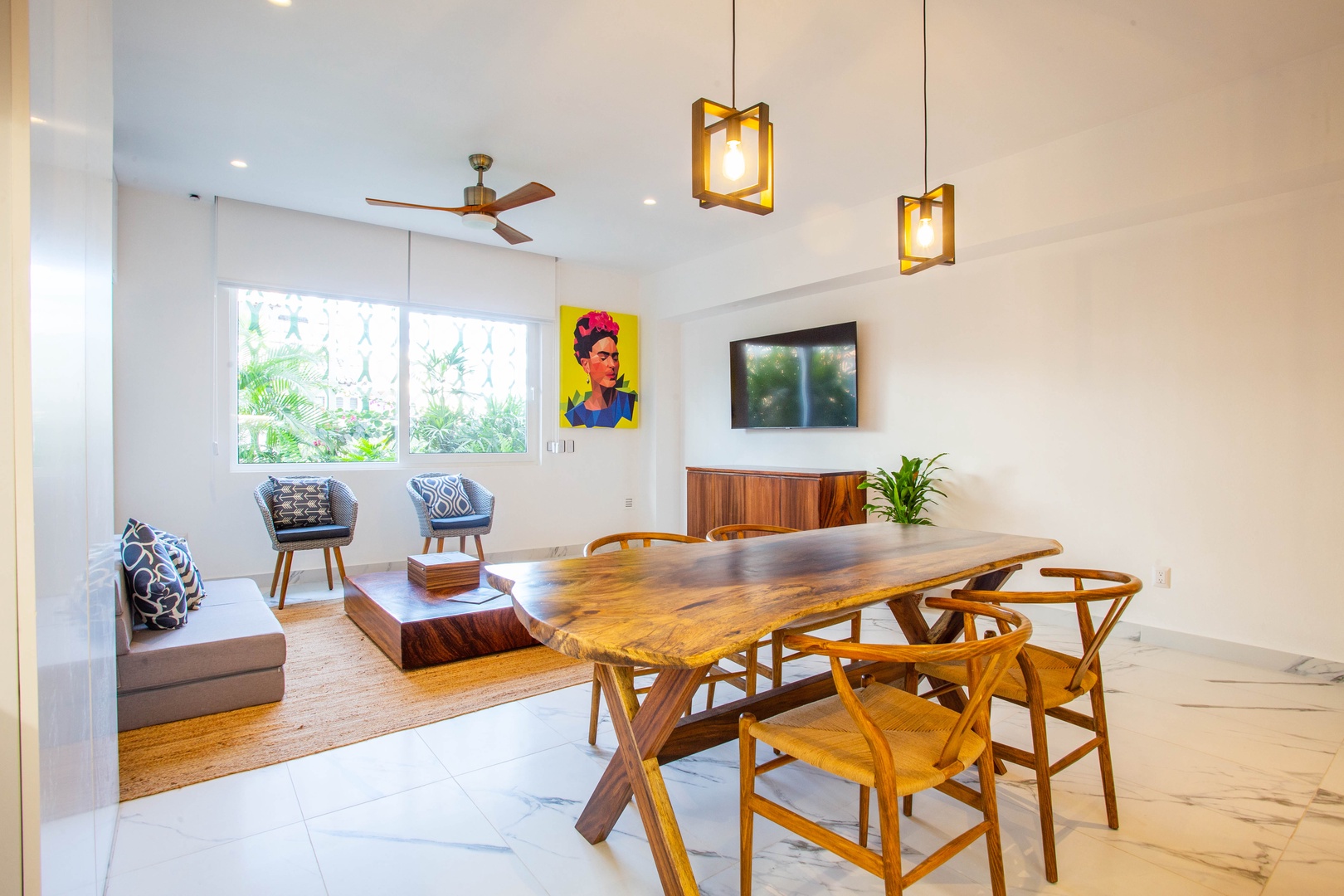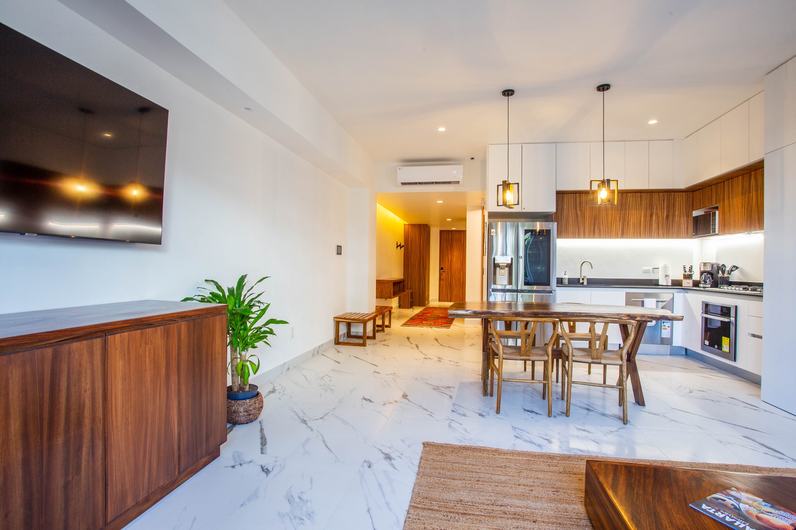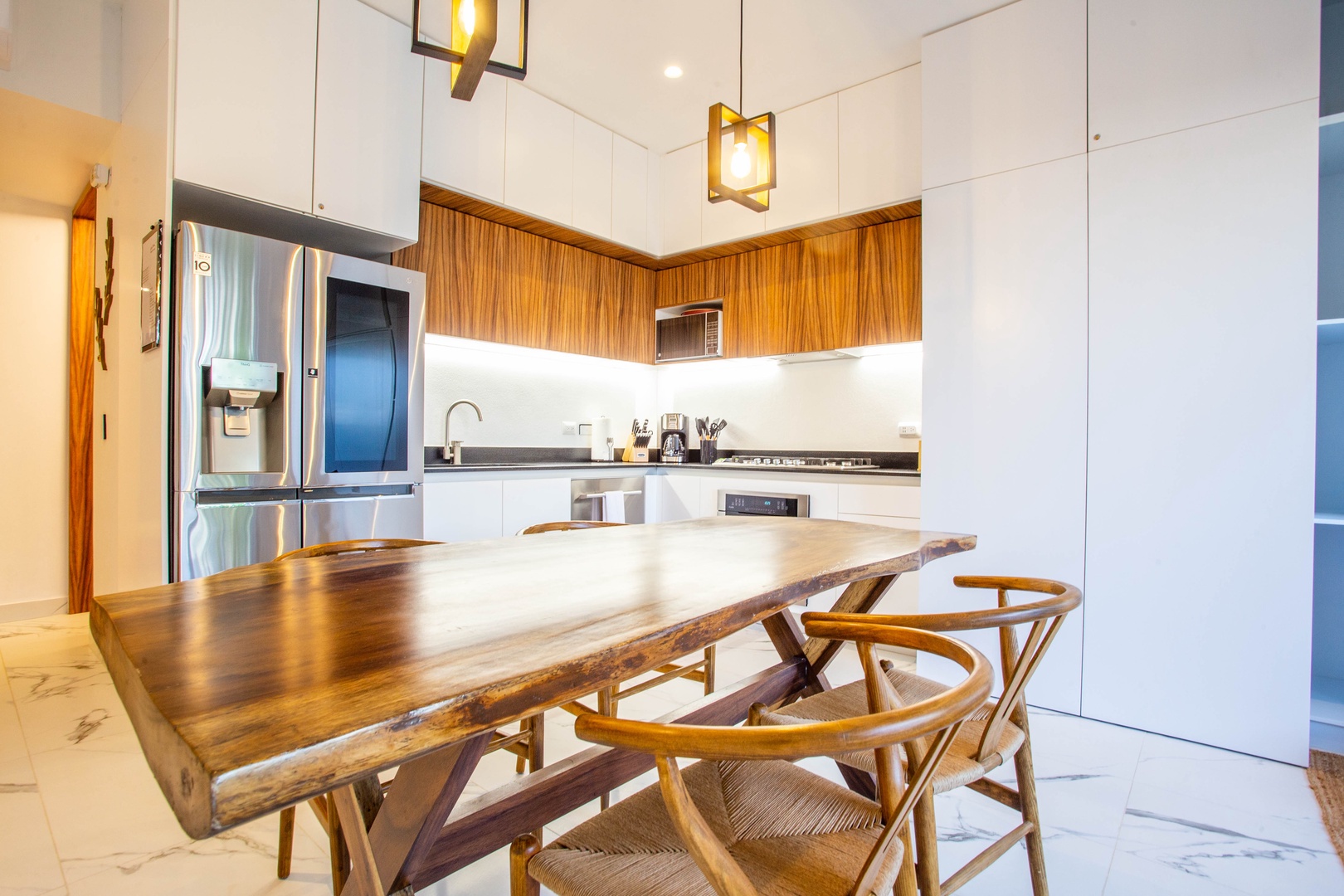 • Kitchen and Dining: Fully equipped with oven, stove, microwave, dishwasher, toaster, blender, coffee maker, and a parota wood dining table for 4