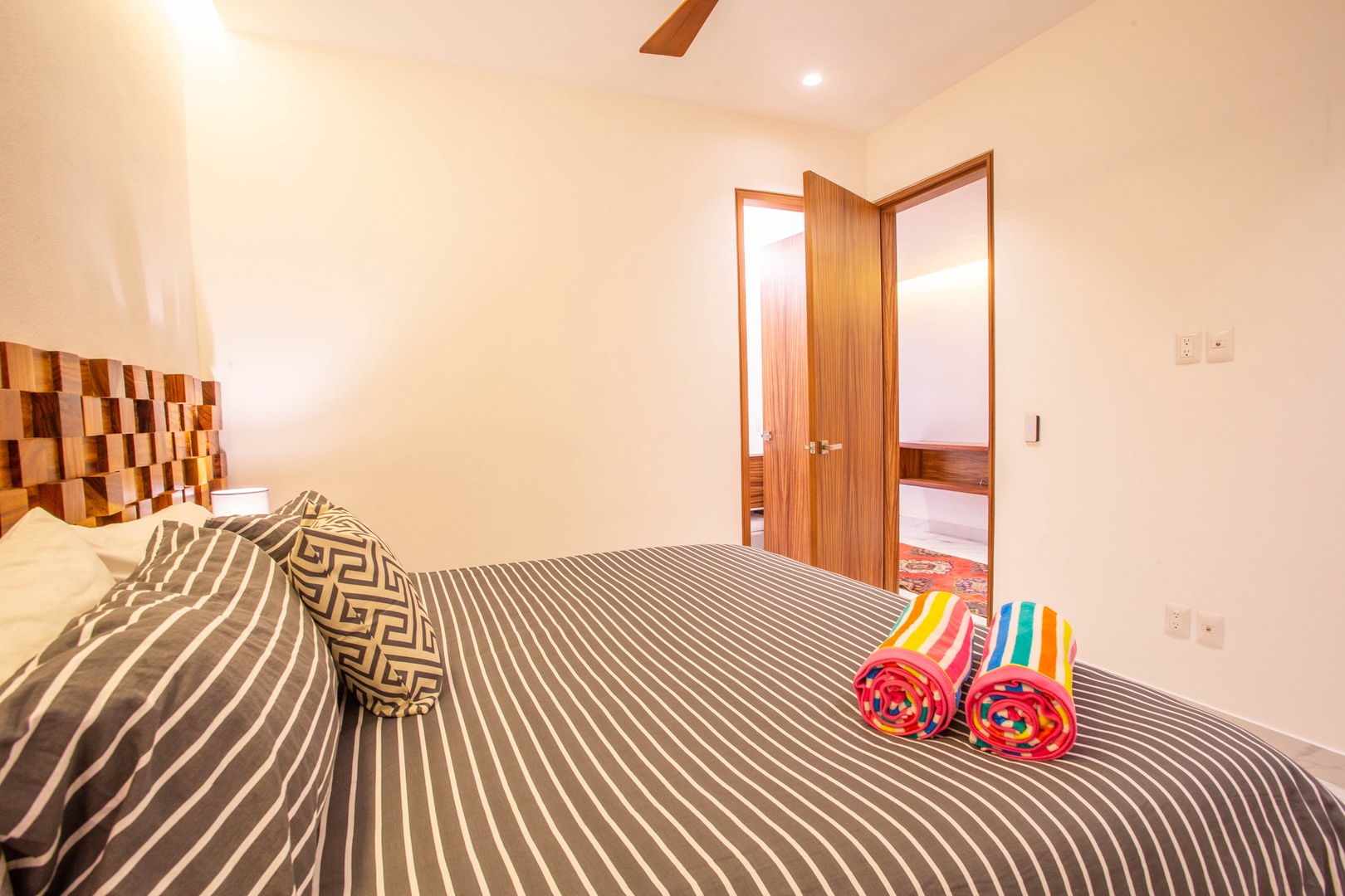 • Bedroom: King-size bed, ensuite bathroom, blackout curtains, and Smart TV