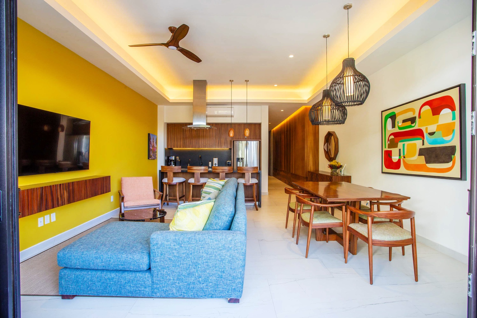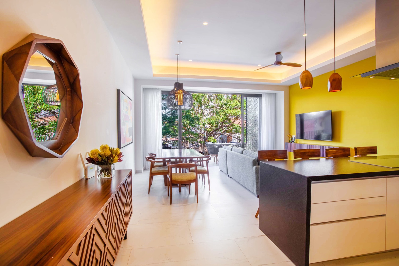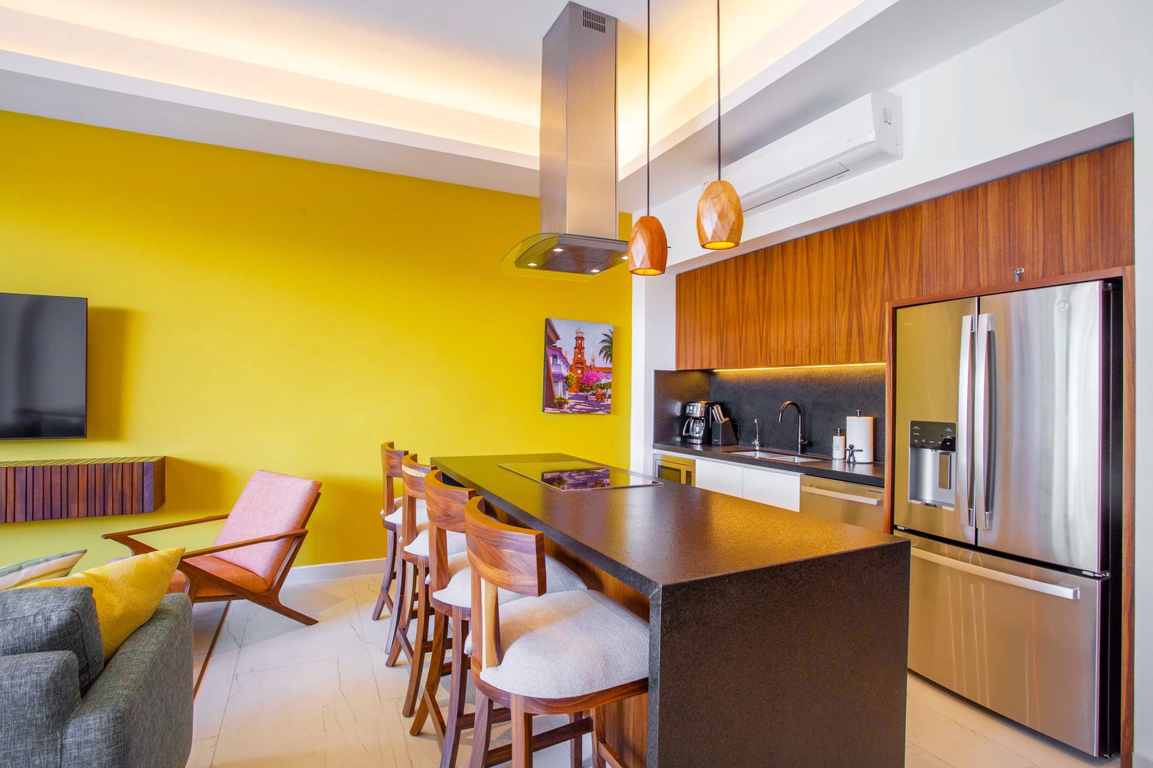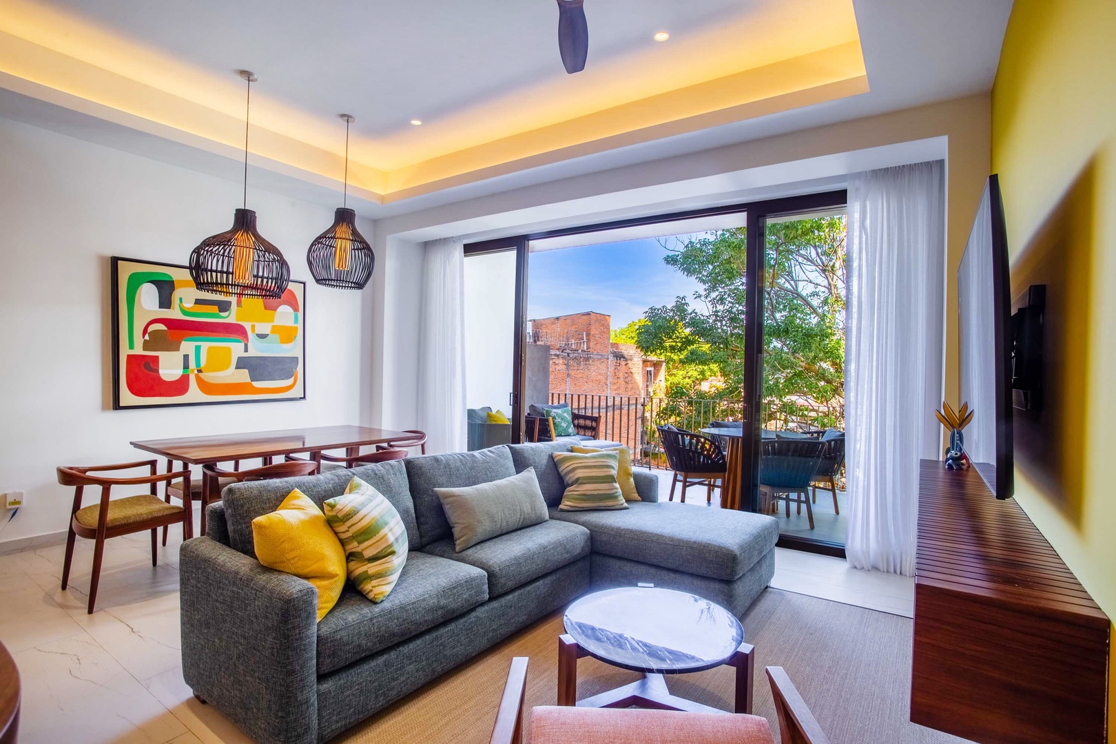 The living area is adorned with tasteful decor and features an additional smart TV, creating an inviting space for relaxation and entertainment.