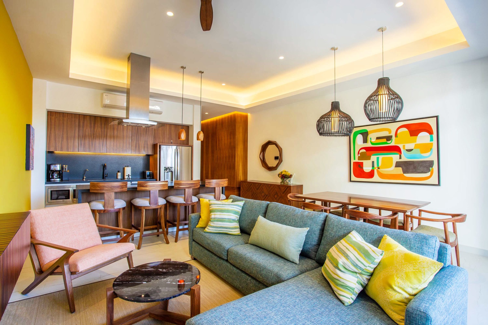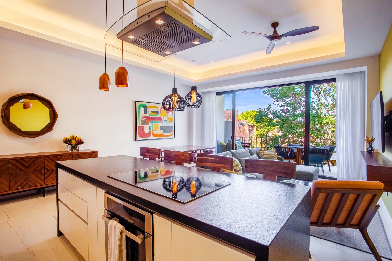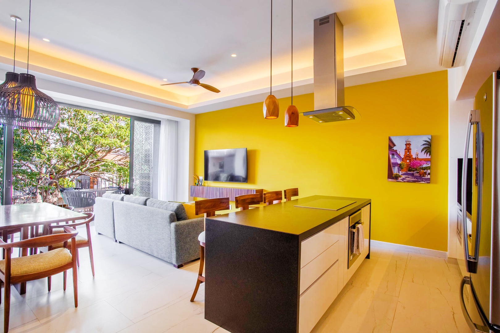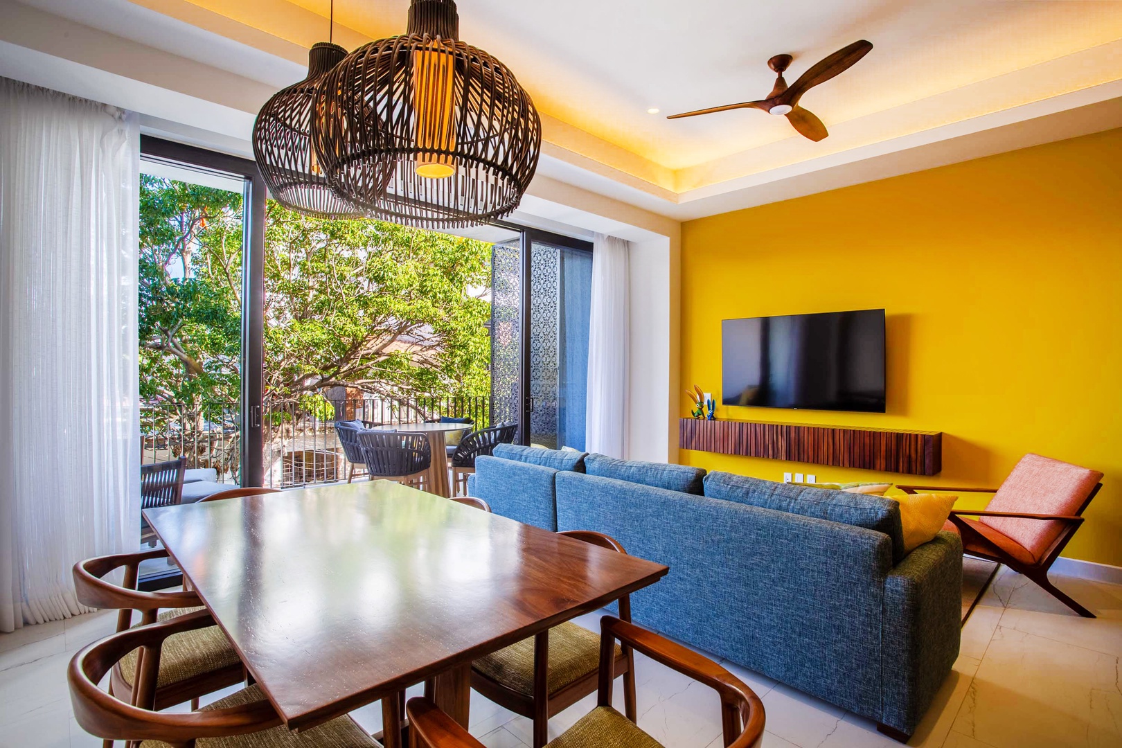 The living area is adorned with tasteful decor and features an additional smart TV, creating an inviting space for relaxation and entertainment.