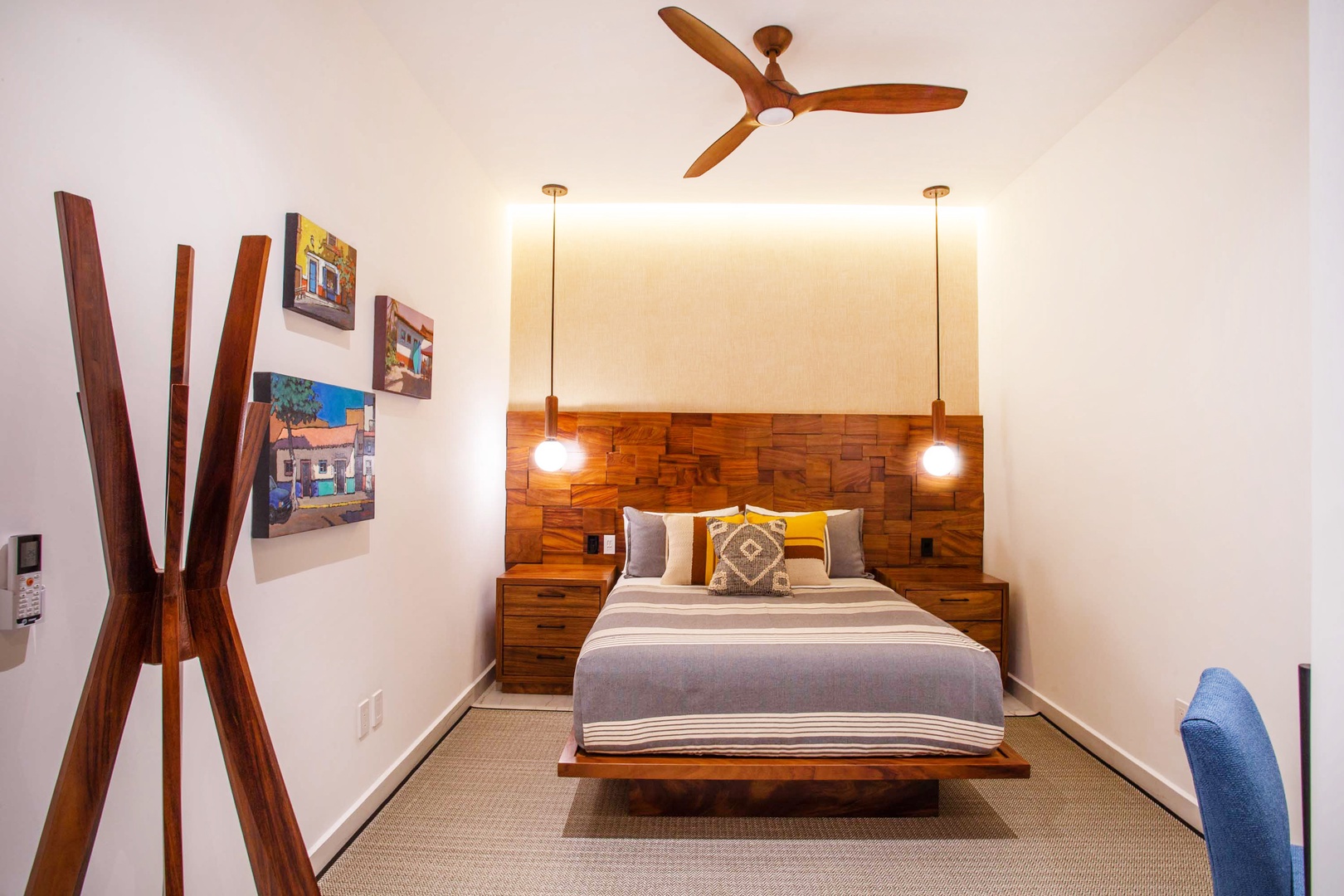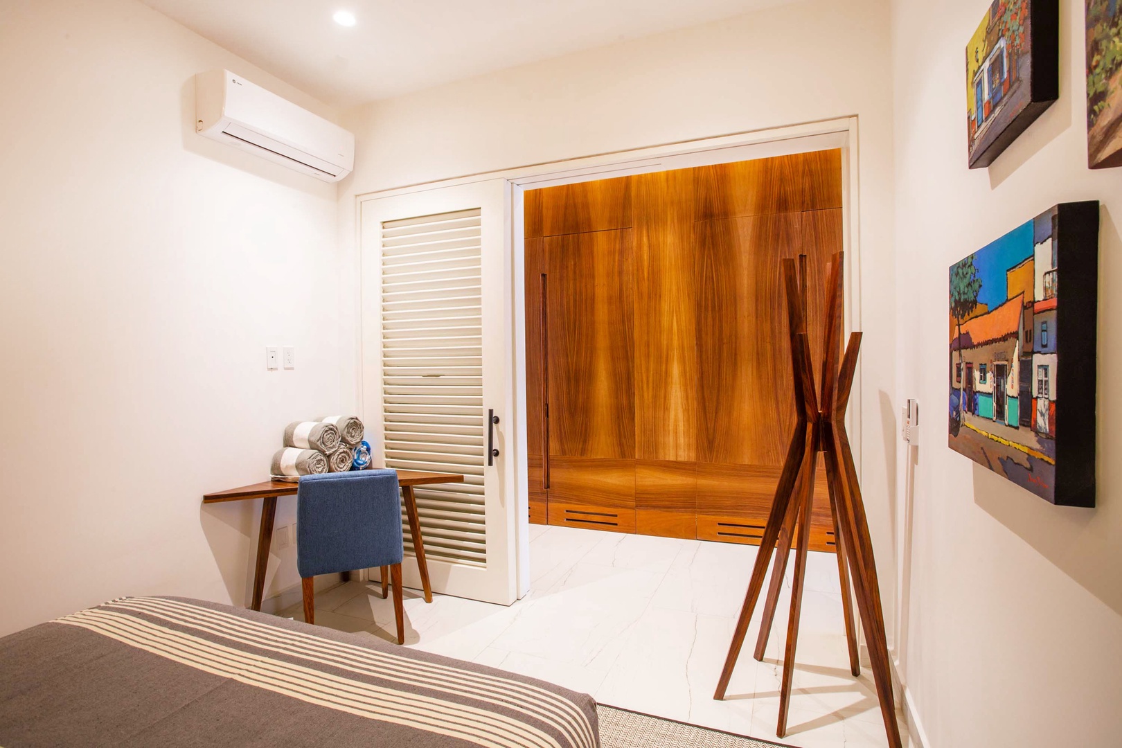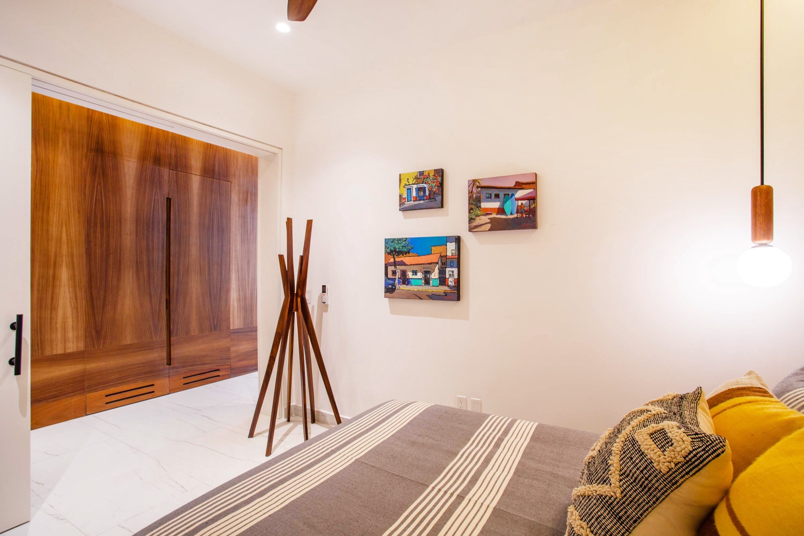Each bedroom is beautifully appointed with comfortable beds and soft linens. The master bedroom features an en-suite bathroom, providing added privacy and convenience. Additionally, it's equipped with a smart TV, offering entertainment options. The guest bedroom features a dedicated workspace, ensuring you can stay connected and productive during your stay.