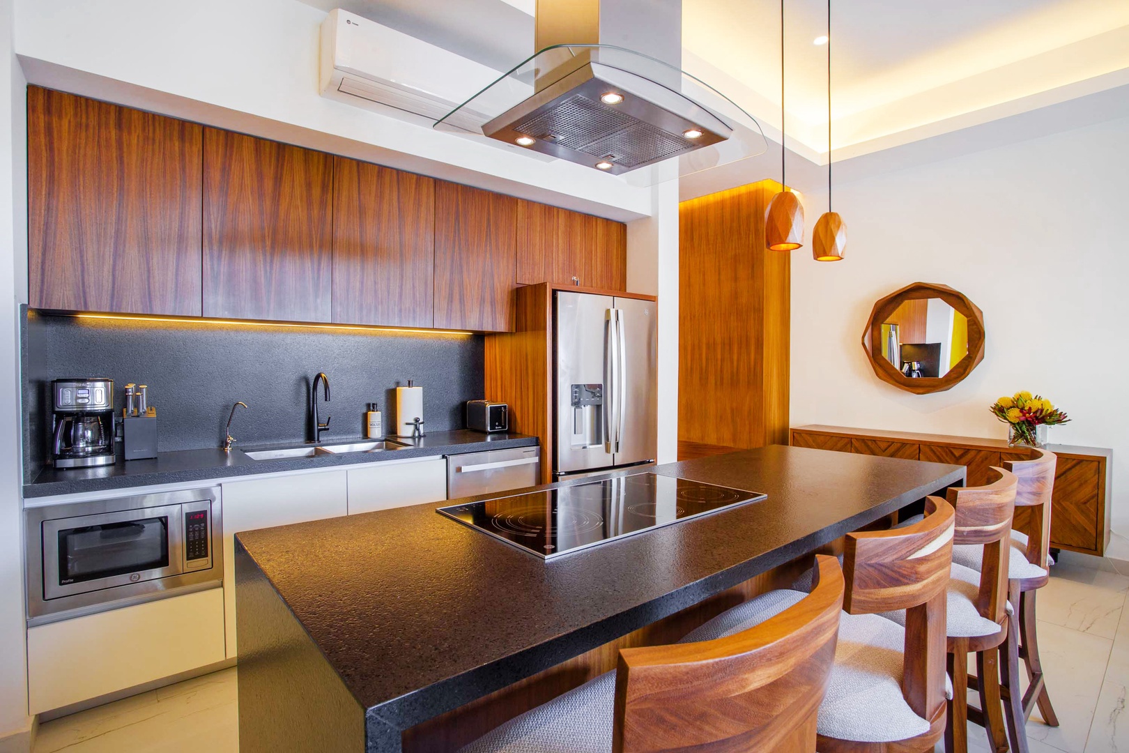 The well-equipped kitchen is a culinary haven, boasting all the amenities you need to prepare delicious meals, such as a full-size refrigerator, a stove, oven, microwave, and dishwasher. Enjoy your creations at the dining table with seating for 6, or head out to the spacious private balcony for an 'al fresco' dining experience.