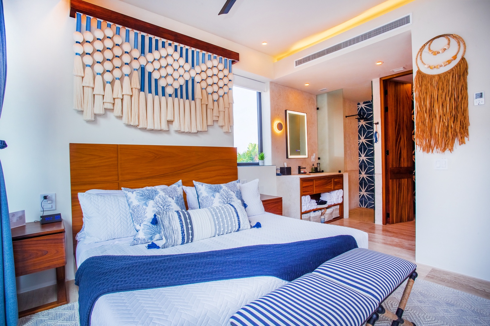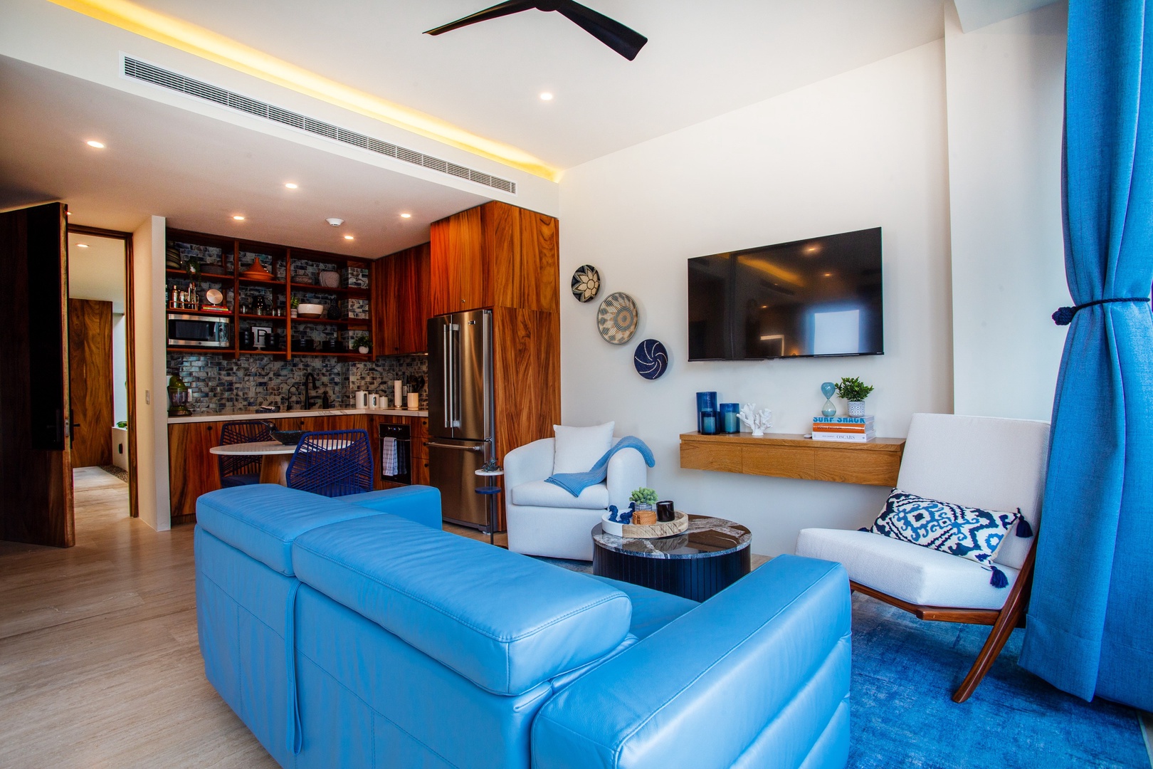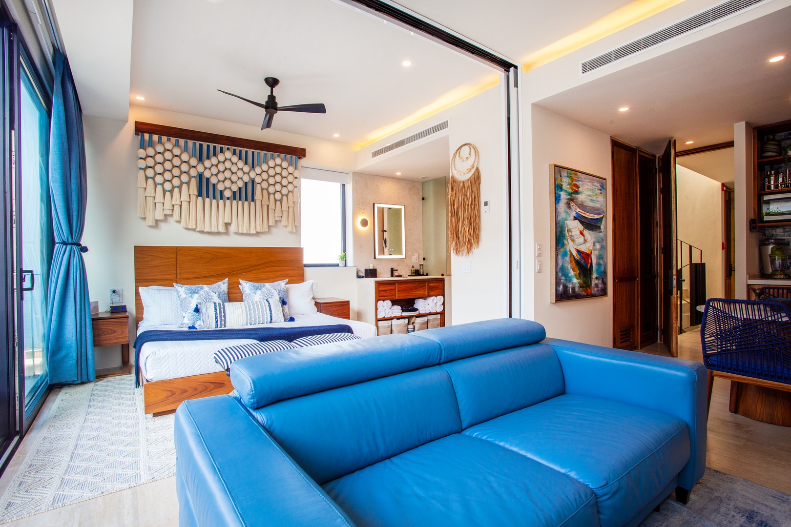 Immerse yourself in the elegant ambiance of this penthouse, adorned with captivating artwork and handmade crafts that complement the soothing blue tones throughout. The attention to detail in the decor creates a serene and tranquil atmosphere, making you feel right at home.