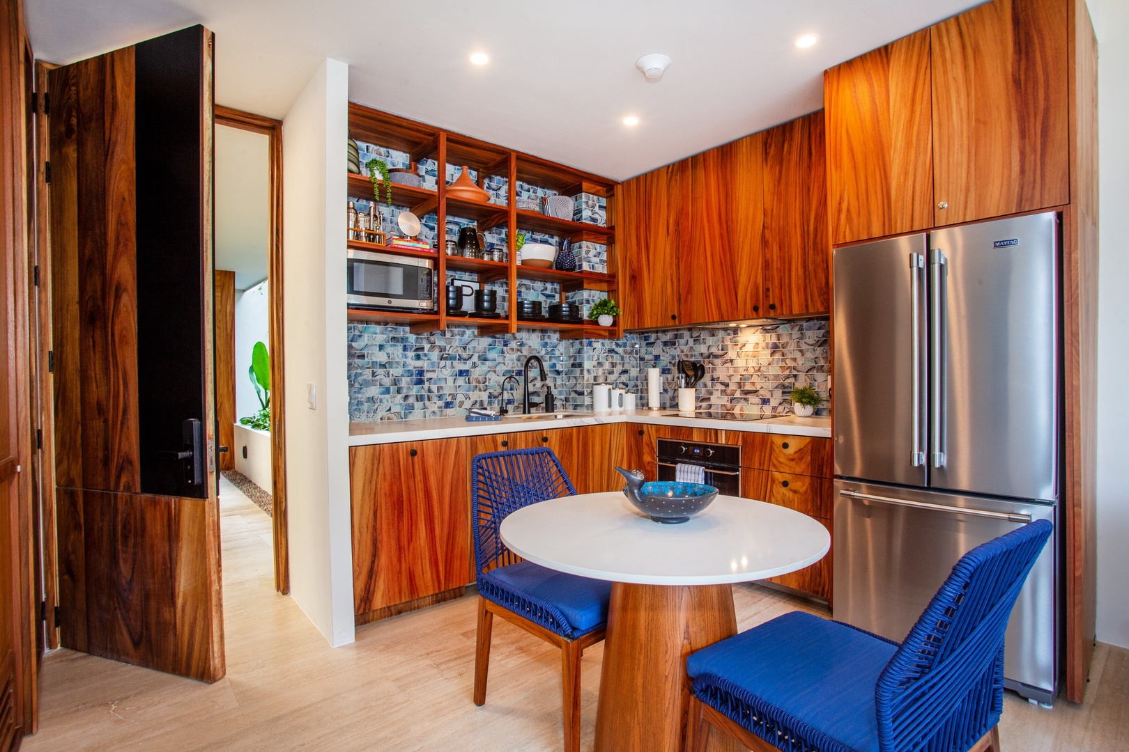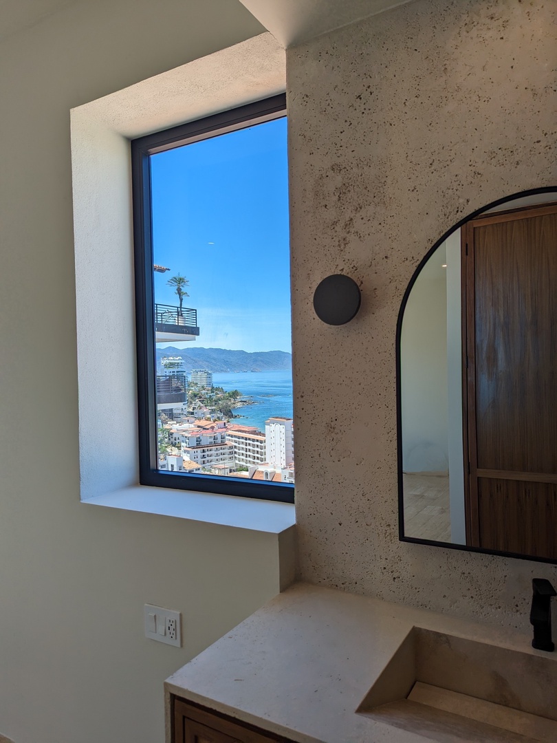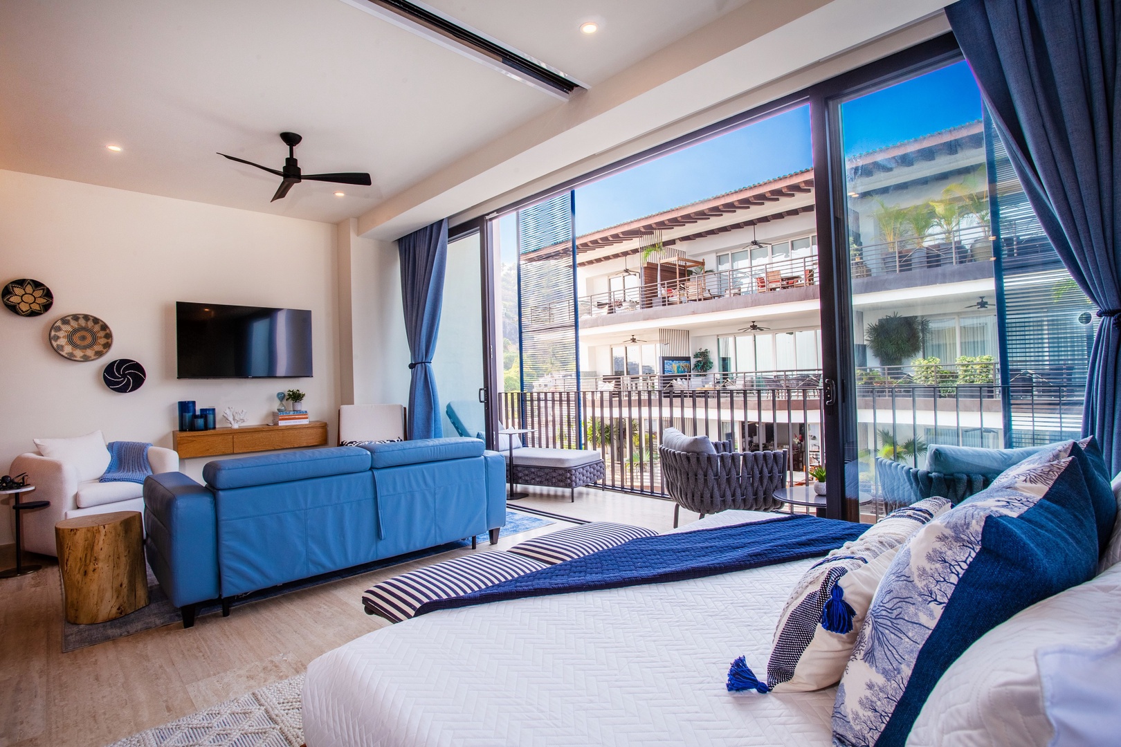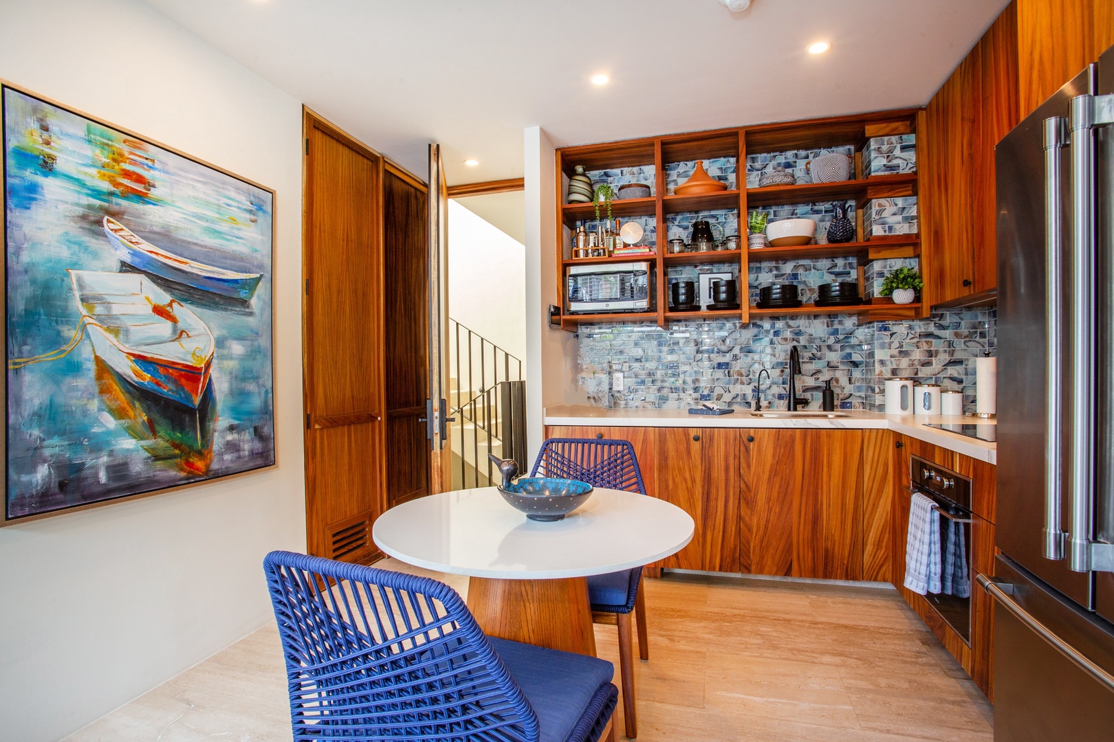 Immerse yourself in the elegant ambiance of this penthouse, adorned with captivating artwork and handmade crafts that complement the soothing blue tones throughout. The attention to detail in the decor creates a serene and tranquil atmosphere, making you feel right at home.
