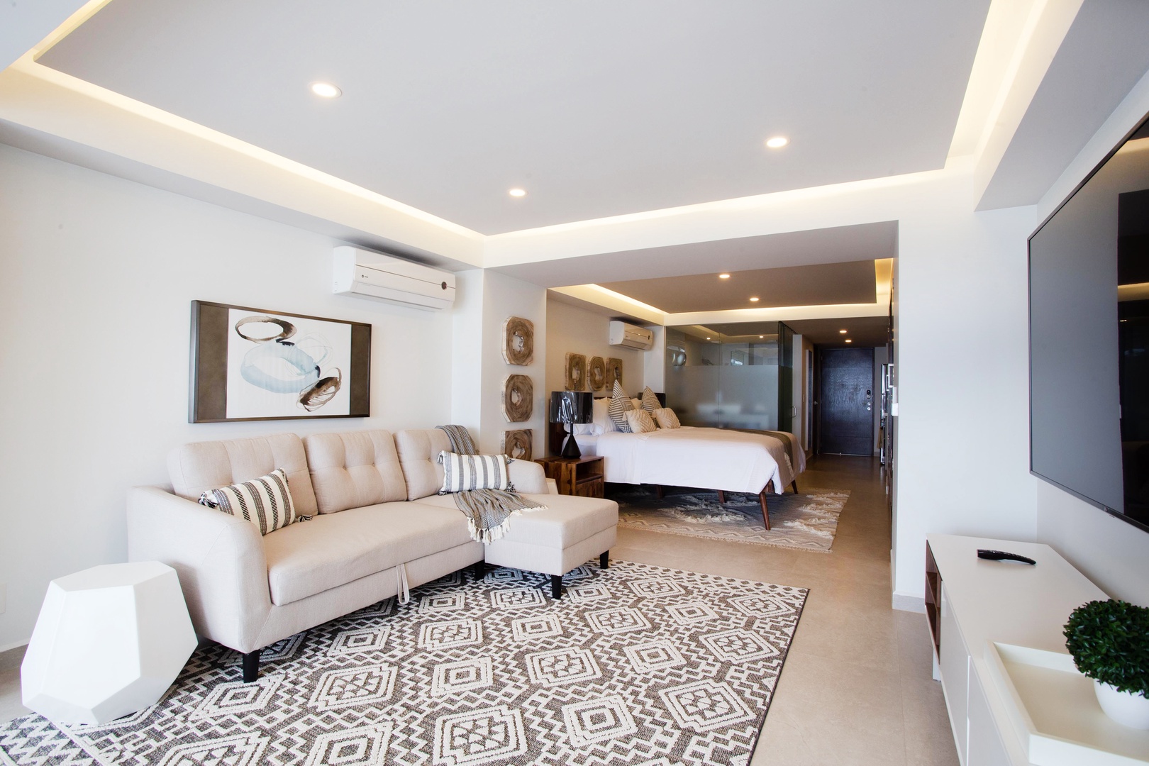 The living area features a large sectional sofa and a huge Smart TV for entertainment purposes. Netflix and Youtube come preloaded for your enjoyment.