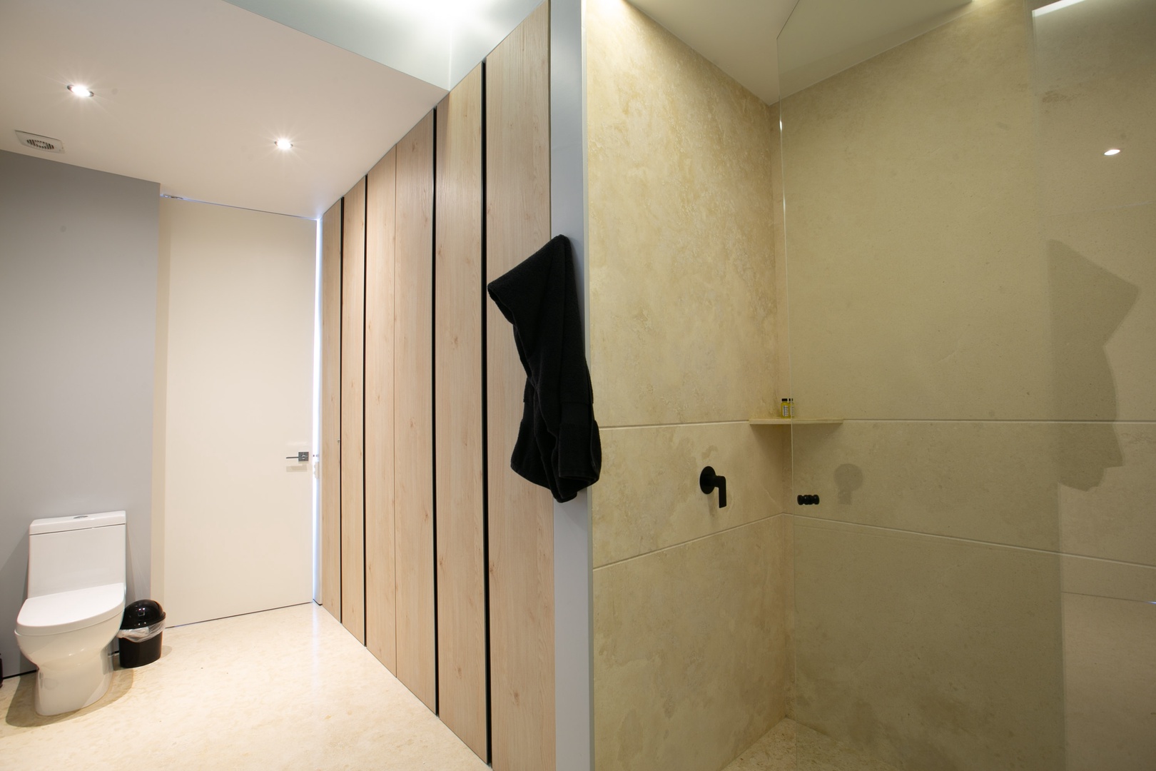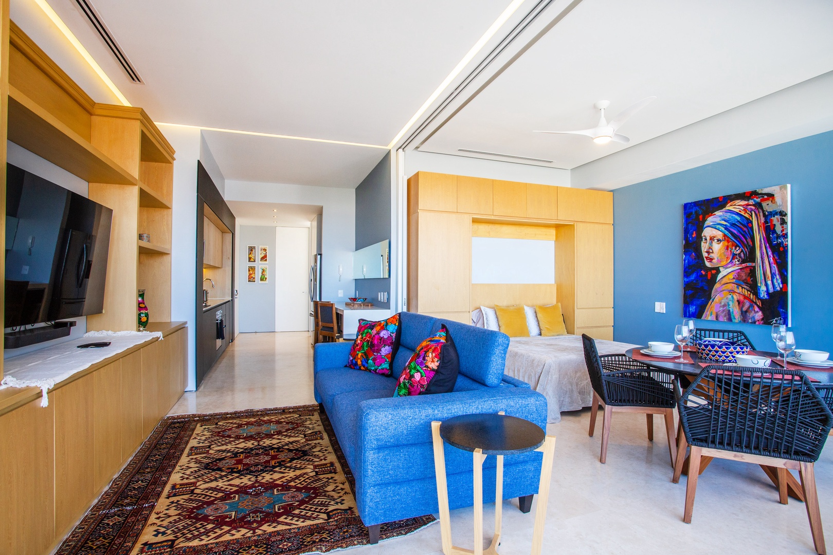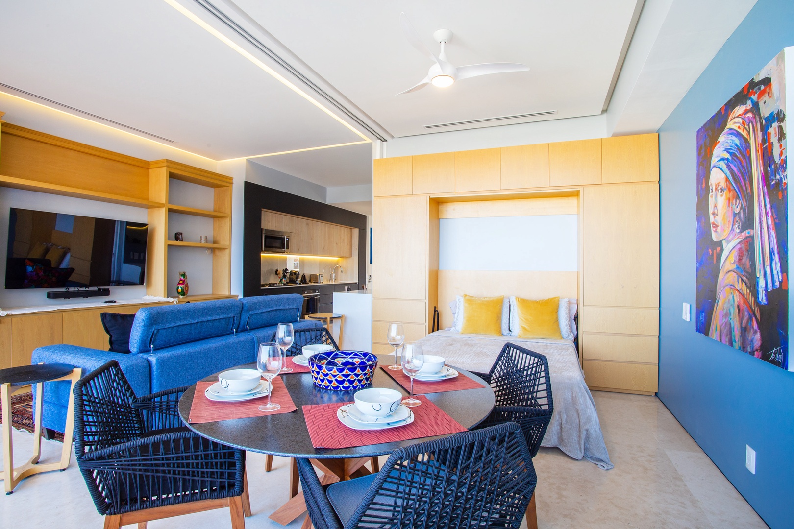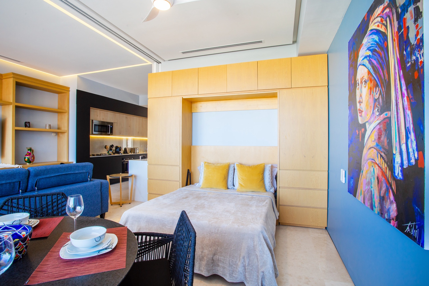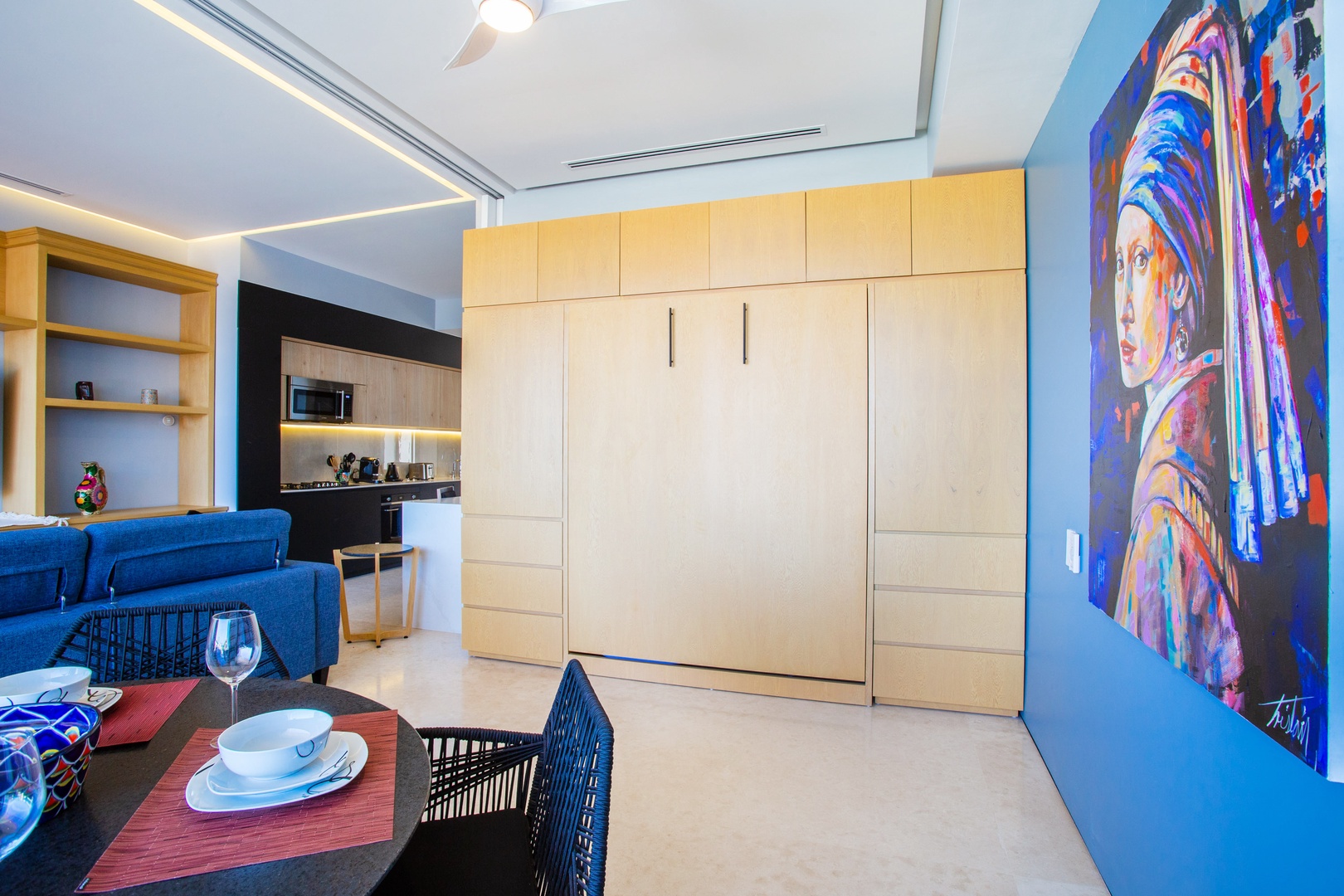 The guest bedroom invites you with its versatile design and thoughtful features. Here, a queen-size murphy bed effortlessly folds away to optimize space during the day, providing ample room for various activities. The presence of a sliding door adds an element of privacy, ensuring an intimate atmosphere.