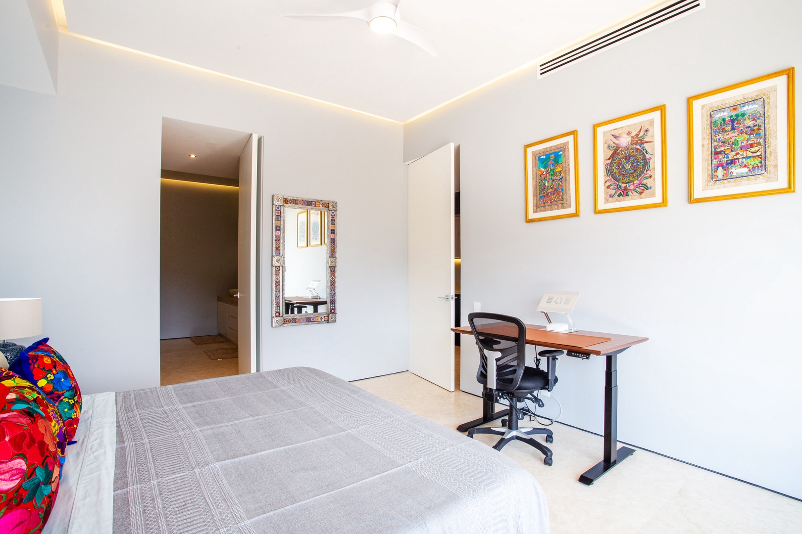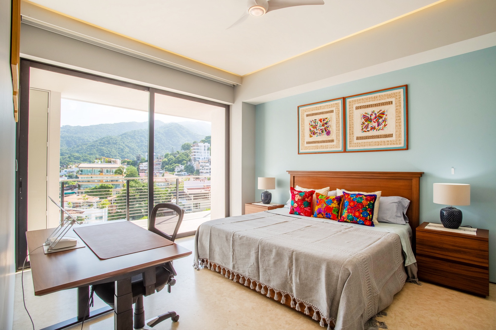 The master bedroom is a sanctuary of serenity that boasts scenic mountain views and it's complete with a comfortable king size bed and an ensuite bathroom. The room is not just a haven for rest but also a functional space, offering a dedicated workspace where you can attend to business matters or simply for pursuing creative activities.