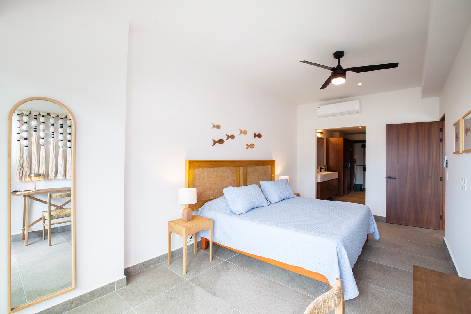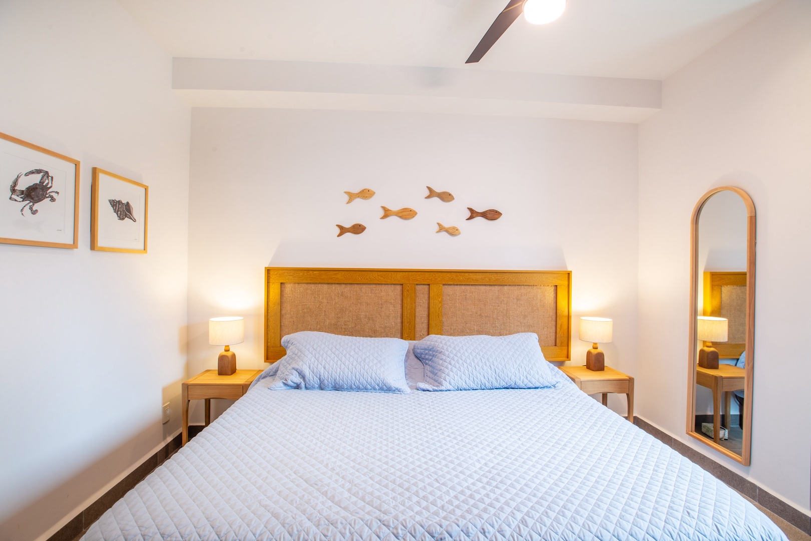 The guest bedroom, equally serene, boasts a king-size bed and an ensuite bathroom, ensuring every guest has their own retreat.