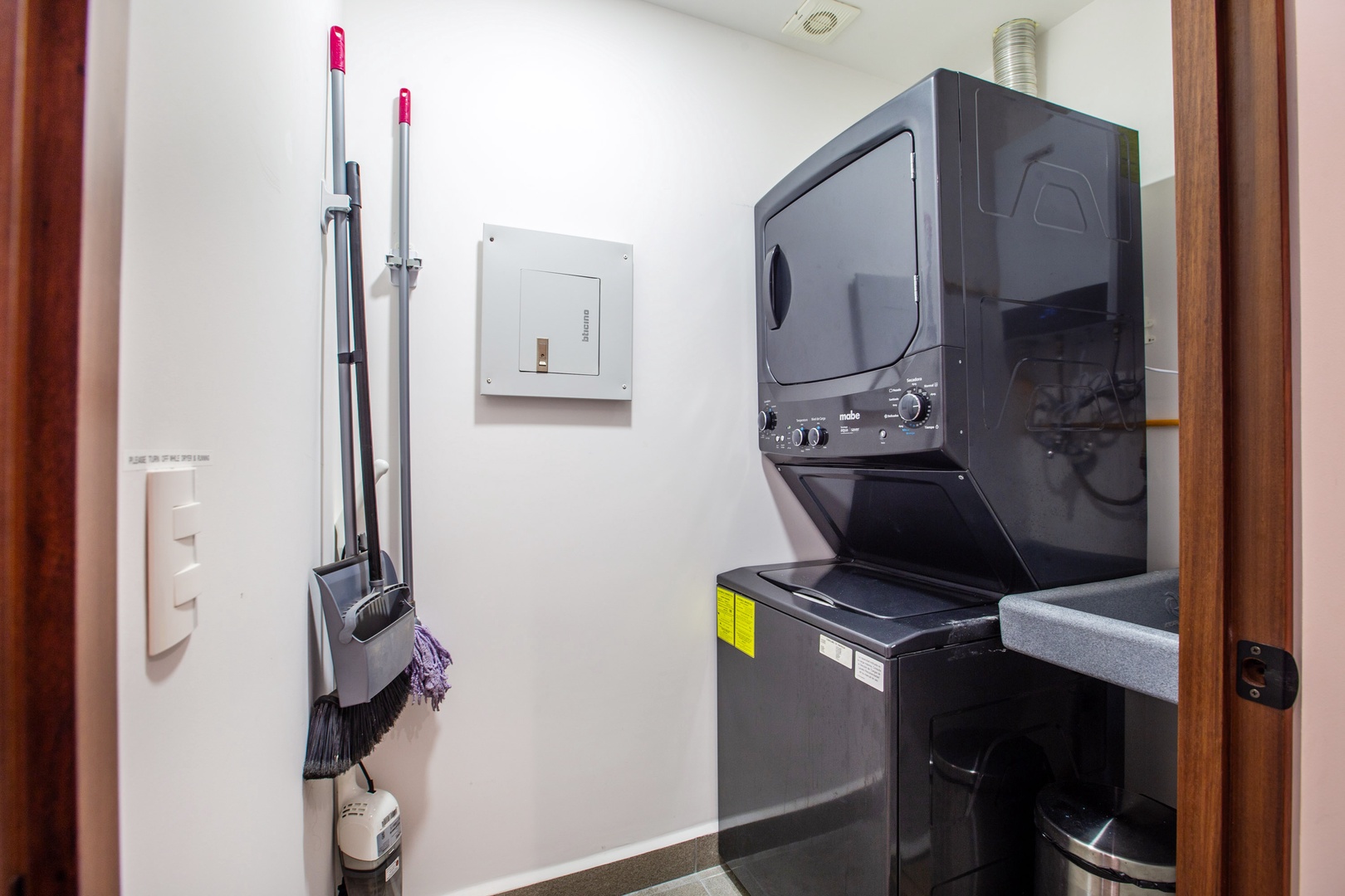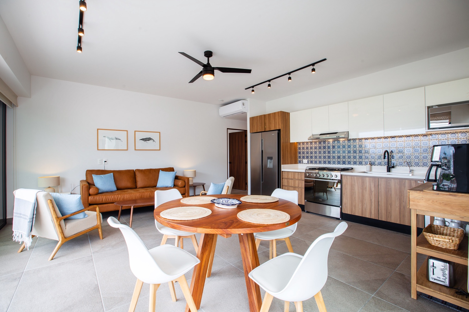 For culinary enthusiasts or casual cooks alike, the sleek kitchen is fully equipped with high-end appliances, including a refrigerator, stove, oven, dishwasher and a coffee station— perfect for preparing anything from breakfast to a sunset dinner. The cozy dining area comfortably seats four.