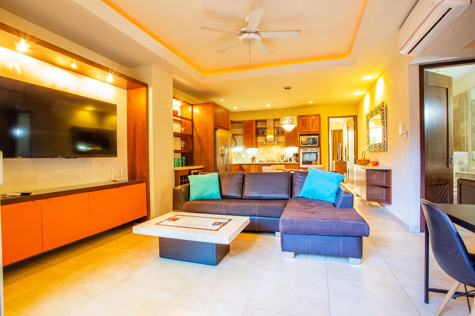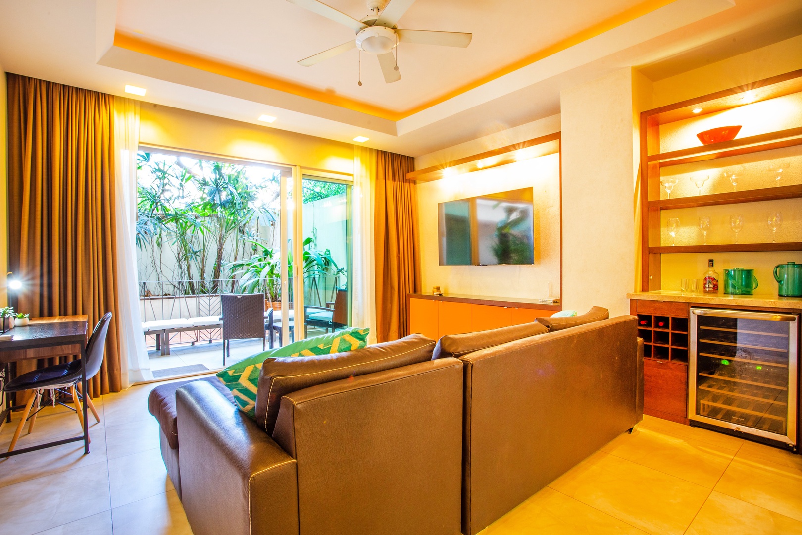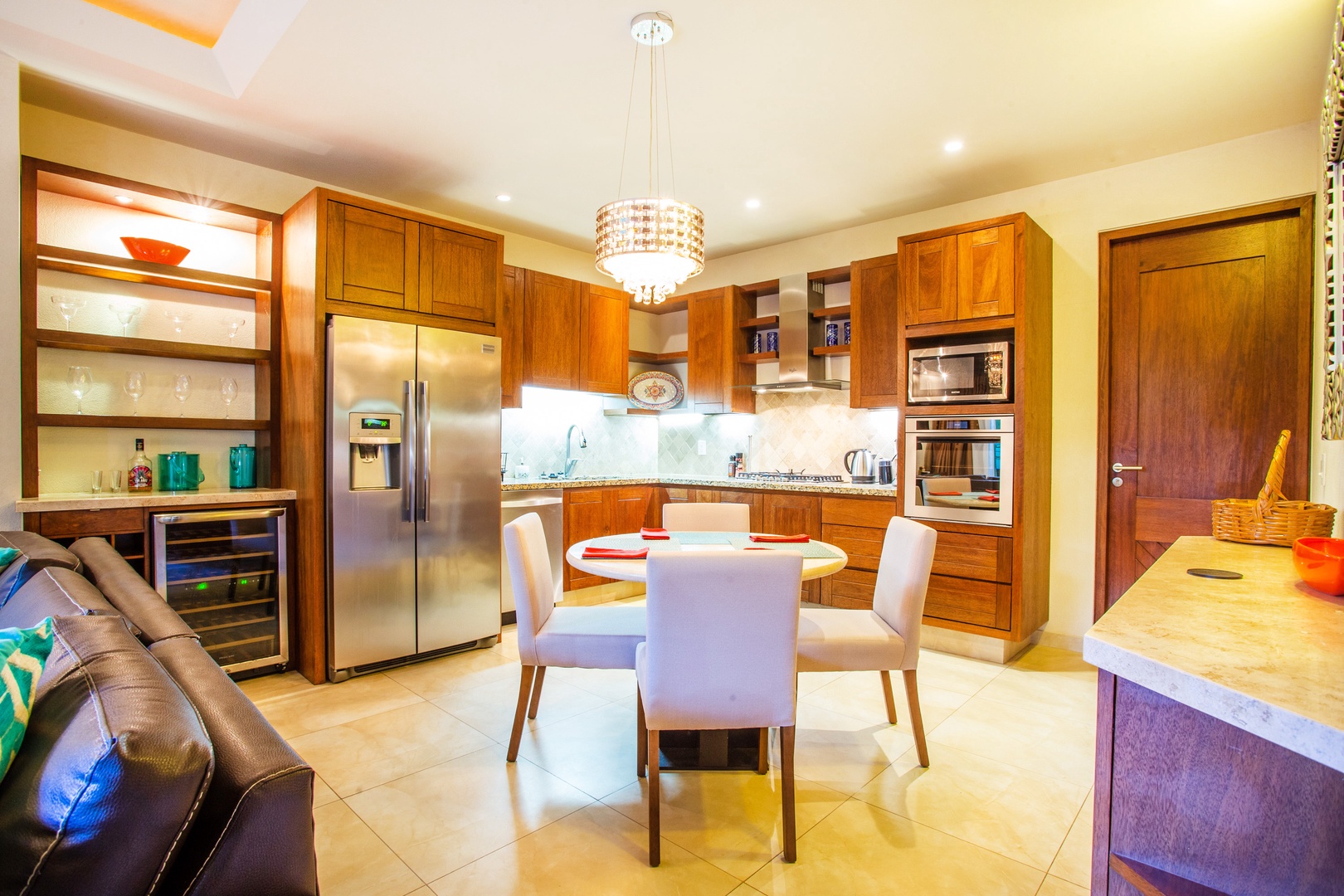 A small mini-bar with a wine fridge is situated between the kitchen and living area, making it a convenient spot for those who enjoy a glass of wine or other chilled beverages. This setup also comes in handy when entertaining guests.