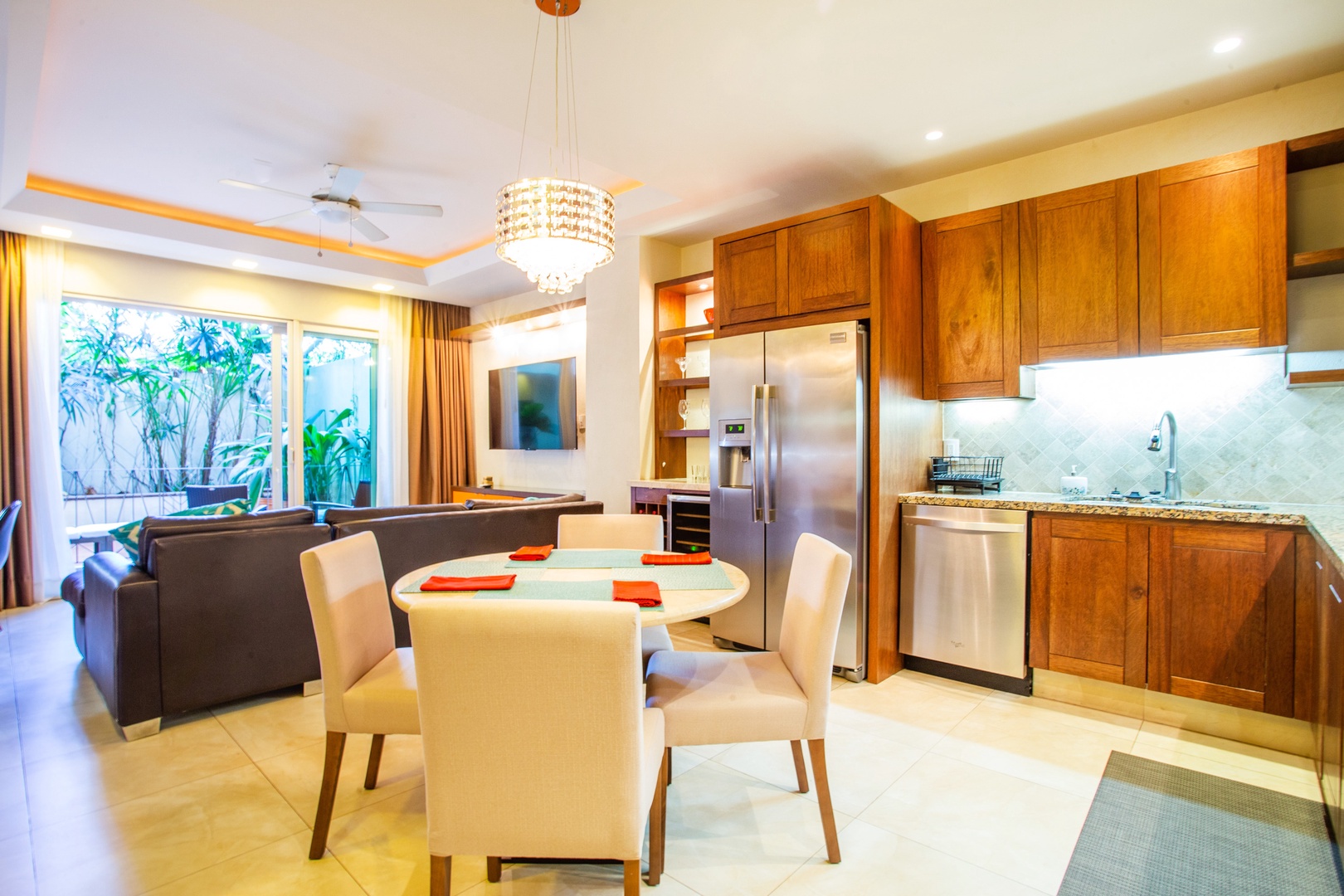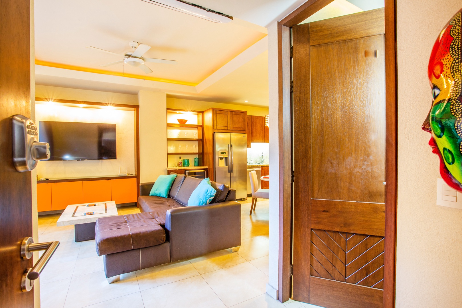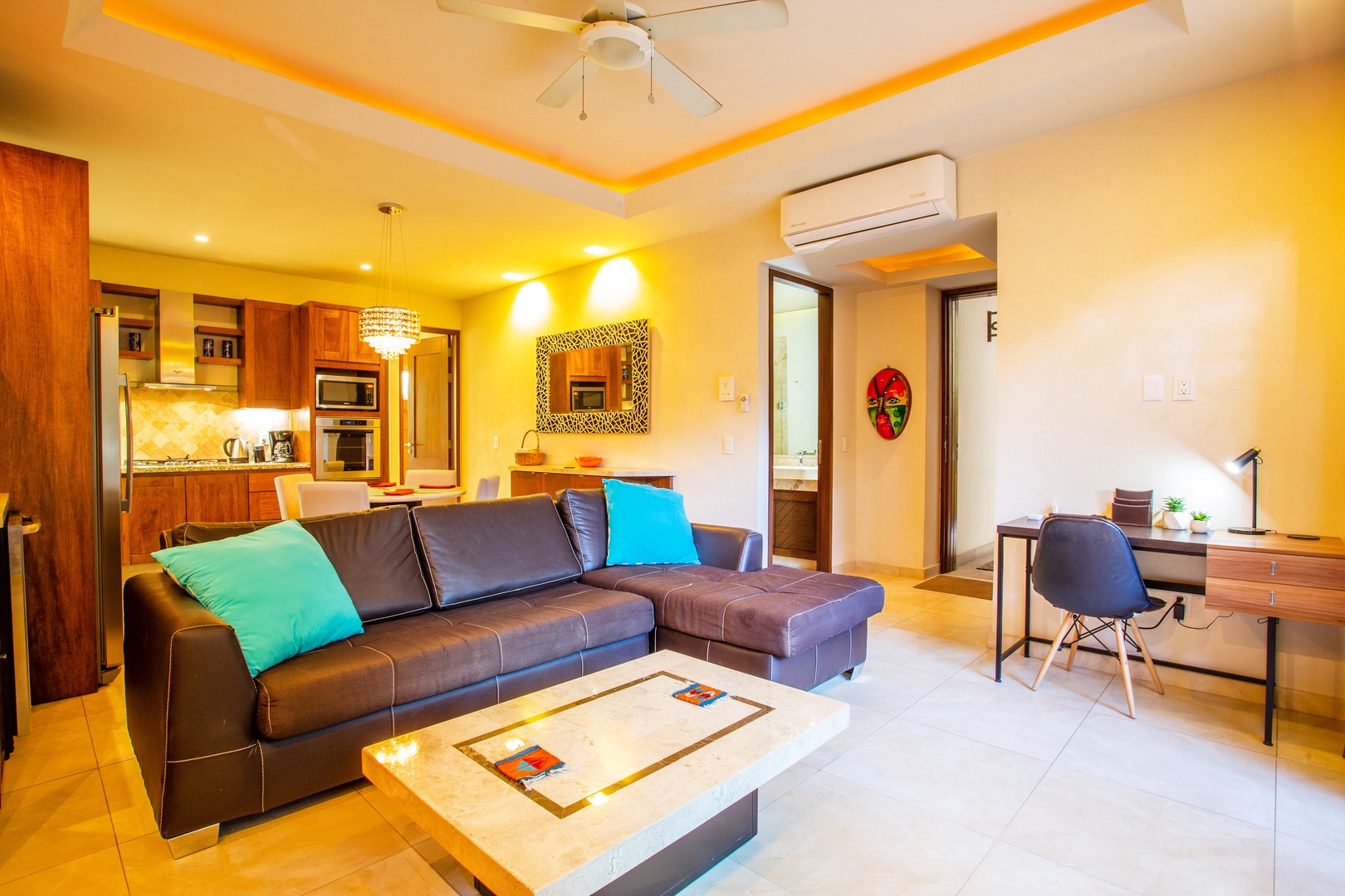 A small mini-bar with a wine fridge is situated between the kitchen and living area, making it a convenient spot for those who enjoy a glass of wine or other chilled beverages. This setup also comes in handy when entertaining guests.