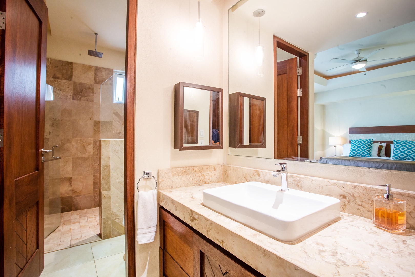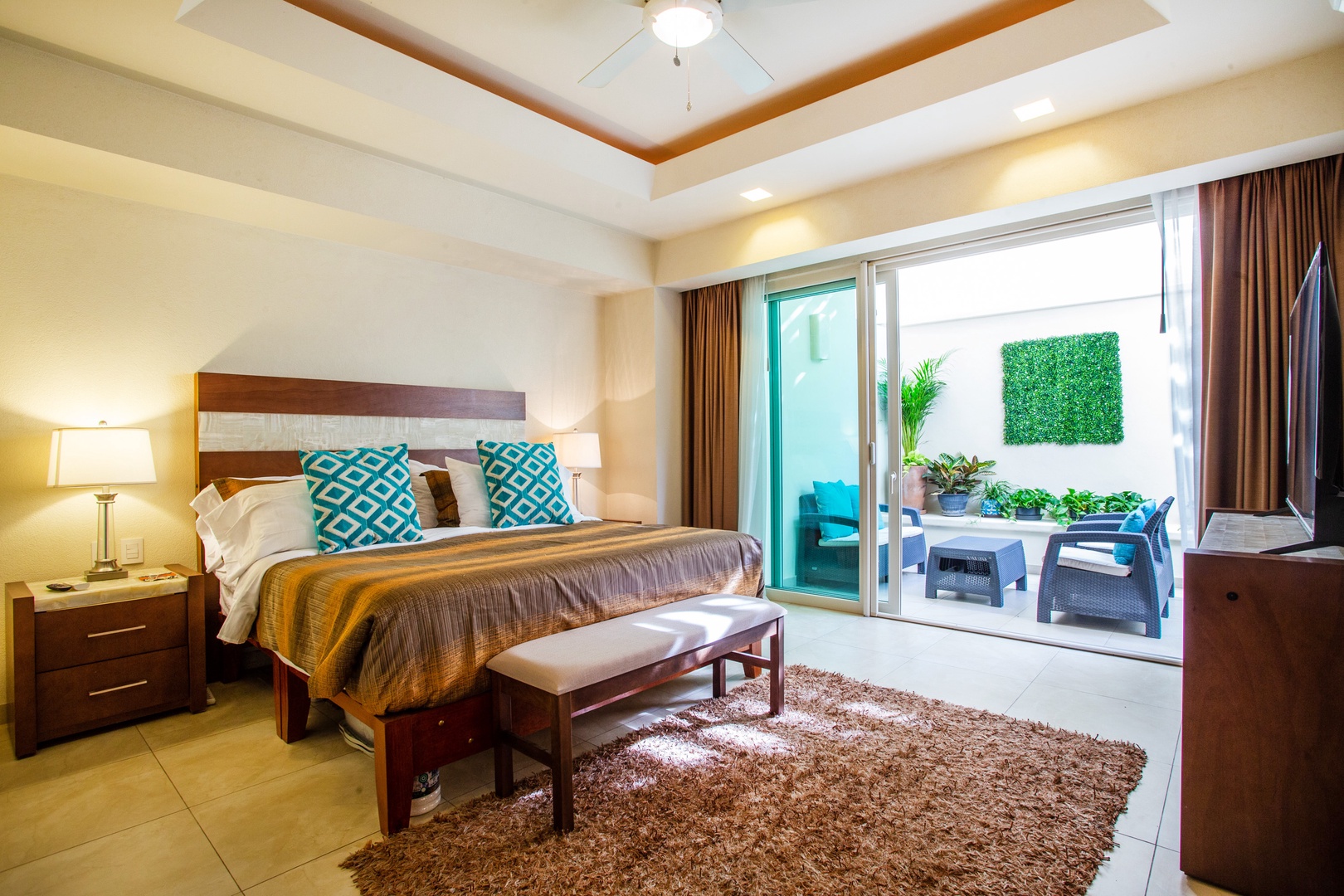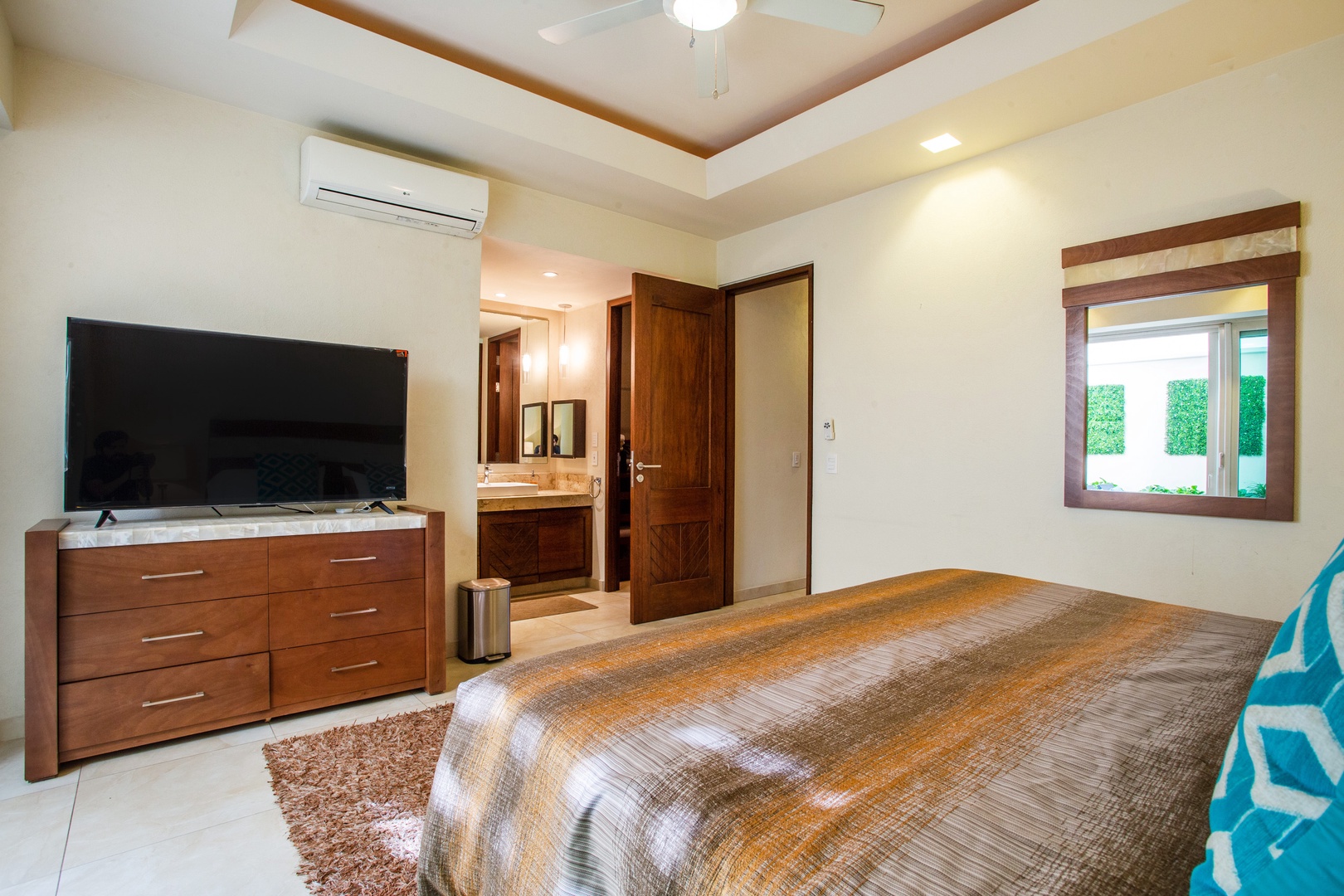 The bedroom is equipped with a comfortable king size bed, ensuite bathroom, smart TV and direct access to the private patio, this is the perfect place to relax after a day on the beach.